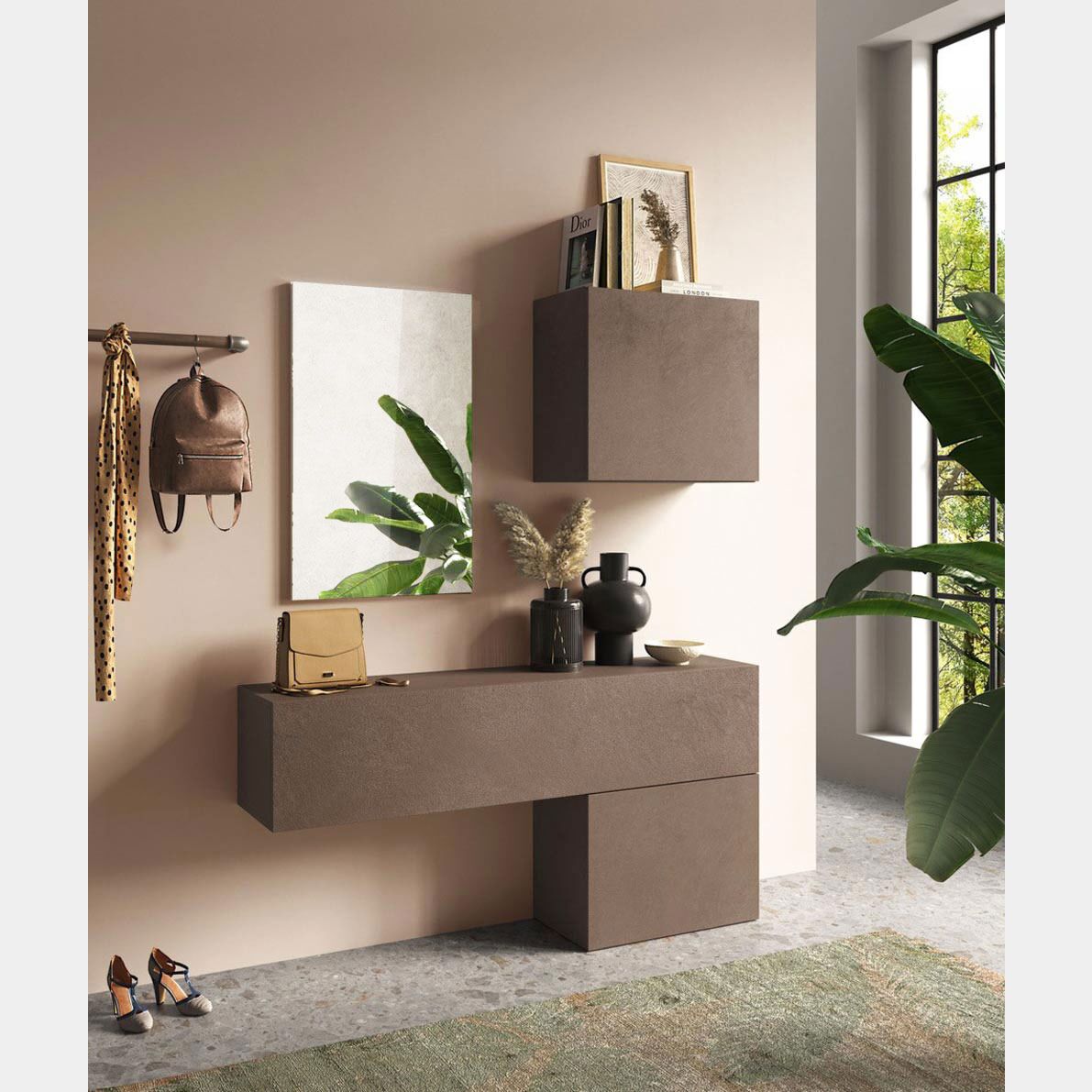 Pensata per ambienti moderni la composizione da ingresso è caratterizzata dalla presenza di più elementi uniti e abbinati tra loro, il risultato è un gioco di colori e volumi.