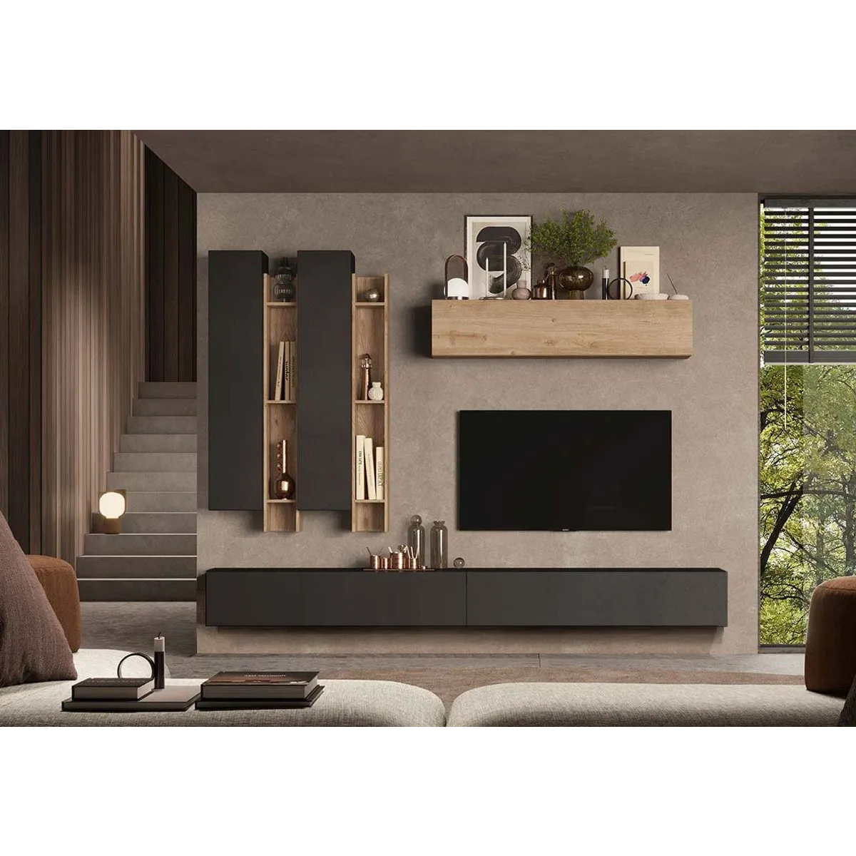 Parete attrezzata sospesa, composta da una base a 2 ribalte, vasistas, 2 pensili e 2 librerie, finitura Cadiz e Lava, personalizzabile. Aggiungi altri elementi al tuo soggiorno oppure vedi tutta la collezione Logica.