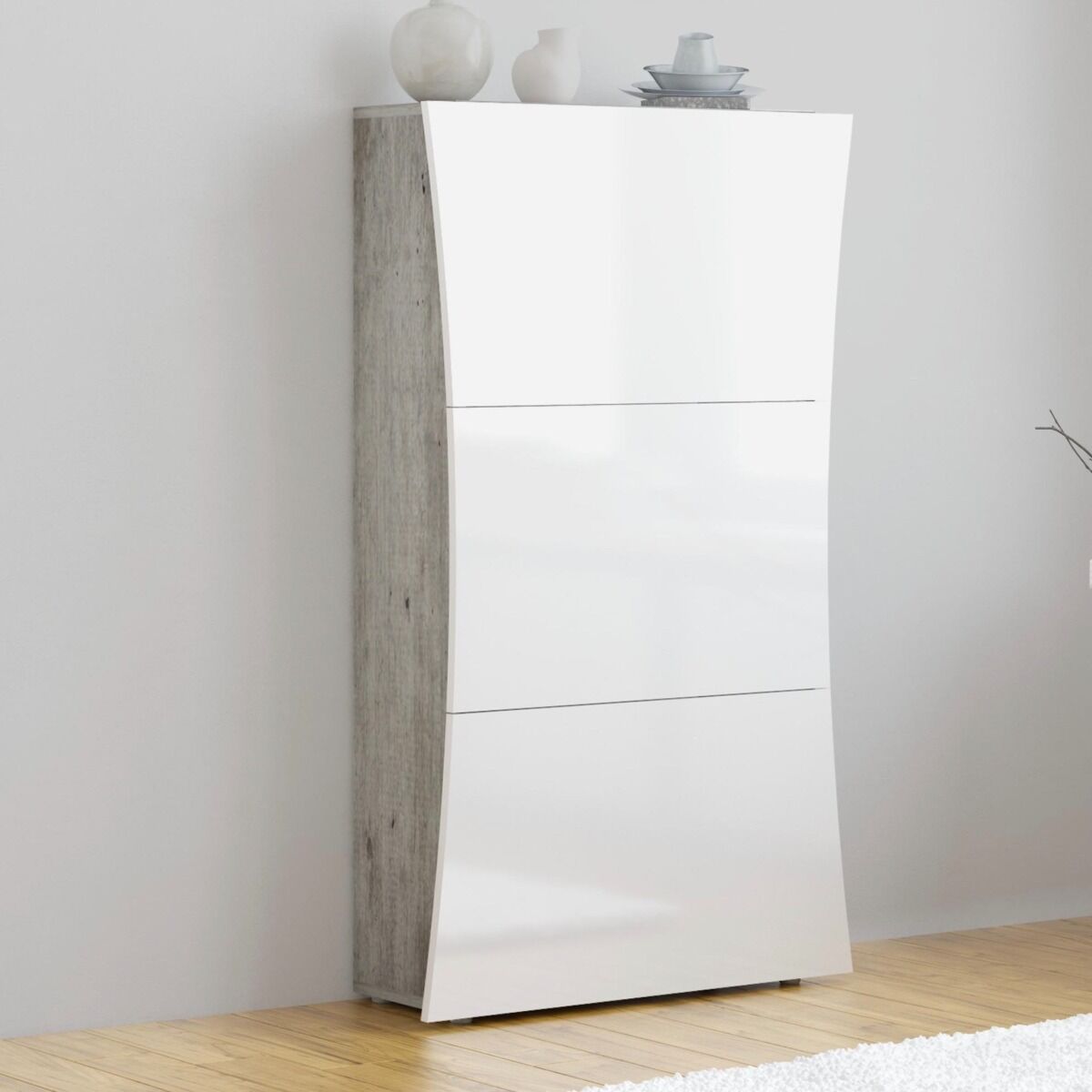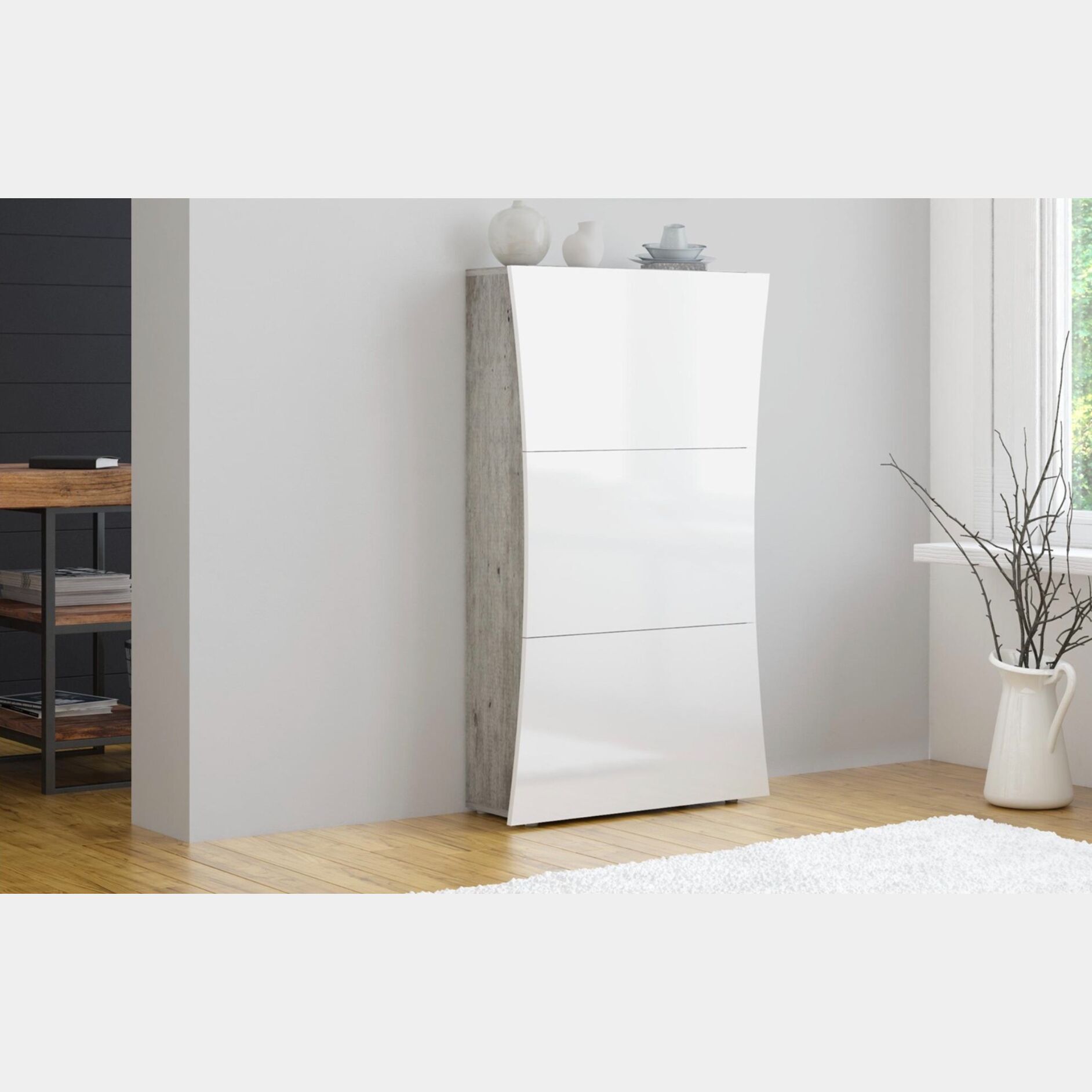 La scarpiera di design che vi proponiamo ha 3 ante ribalta ideali per contenere da 18 a 22 paia di scarpe le ante sono ad arco e sporgono 5 centimetri per lato per poter aprire senza l 'ausilio di maniglie, utile per l'arredo.