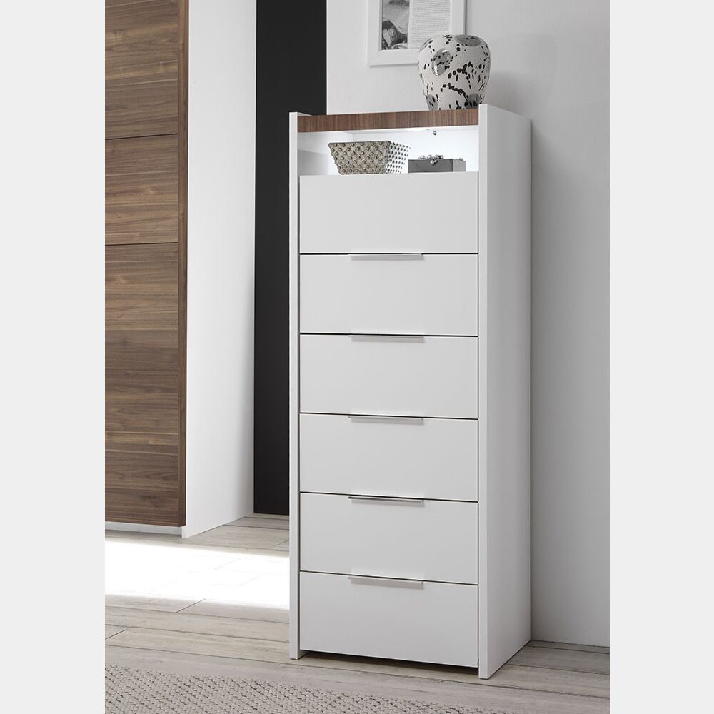 Settimino con vano a giorno, finitura Bianco Opaco e Noce Dark. Un mondo di convenienza. Settimino 6 cassetti con vano a giorno con piano Noce Dark e finitura scocca bianco opaco.