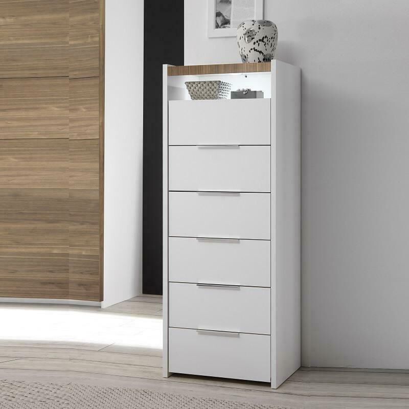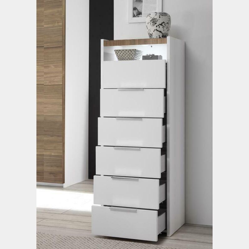 Conveniente Settimino moderno con 6 cassetti e vano a giorno, Bianco Opaco e Noce Stelvio
