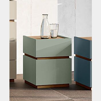 I comodini sono composti da 2 cassetti, il cassetto superiore può essere di finitura diversa rispetto al cassetto inferiori oppure nella stessa finitura (come in foto).In foto tutti e 2 i cassetti sono in finitura agave. Zoccolo, gola e top in noce biondo.