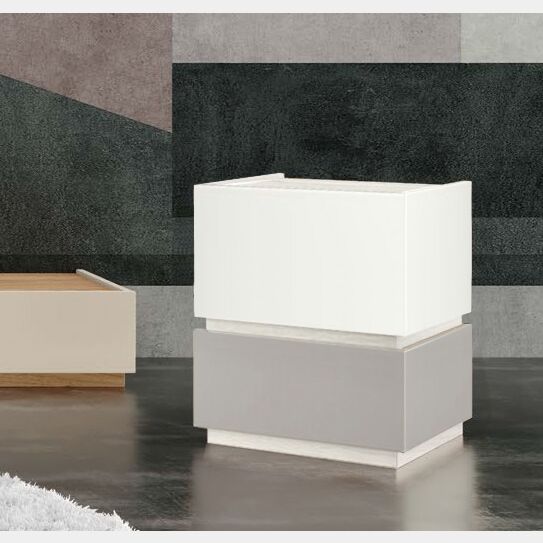 I comodini sono composti da 2 cassetti, il cassetto superiore può essere di finitura diversa rispetto al cassetto inferiori oppure nella stessa finituraIl cassetto superiore è finitura bianco opaco, mentre il cassetto inferiore è grigio seta.