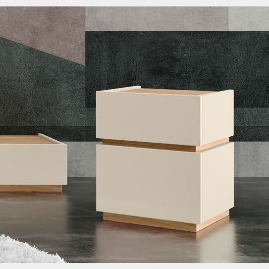 I comodini sono composti da 2 cassetti, il cassetto superiore può essere di finitura diversa rispetto al cassetto inferiori oppure nella stessa finitura (come in foto).In foto tutti e 2 i cassetti sono in finitura orzo opaco. Zoccolo, gola e top in noce biondo.