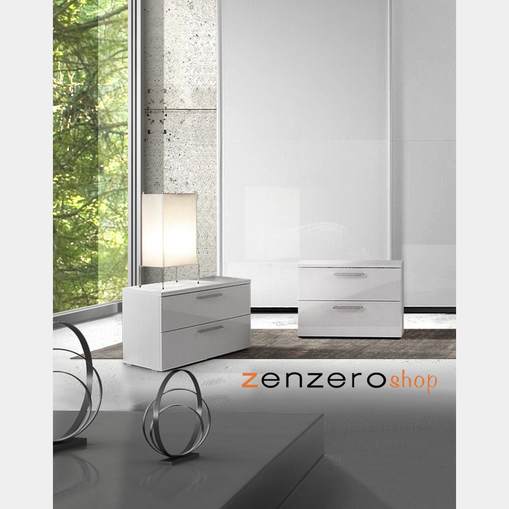 Prodotto Made in Italy. Comodino bianco lucido con guide in metallo. Top spessore cm. 22 laccato bianco.