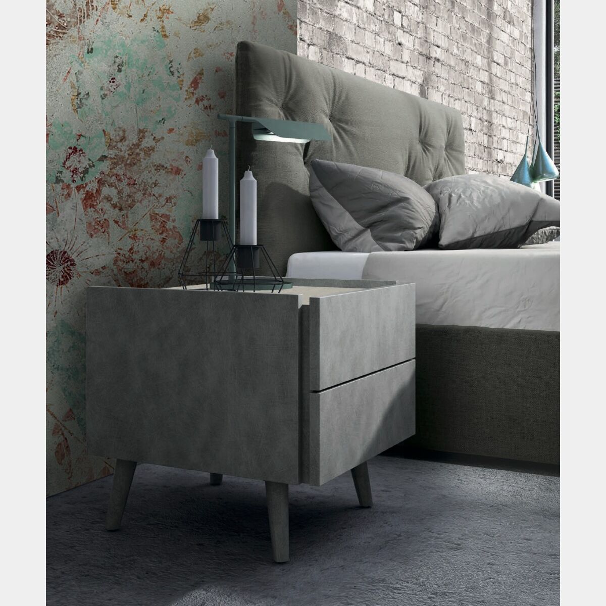 La finitura proposta per la coppia di comodini è metal grey per la struttura e piedini, il top invece è in finitura Canapa. Grazie ad un'ampia gamma di colori è possibile personalizzare il comò per adattarlo al meglio al proprio stile ed alla propria camera da letto.