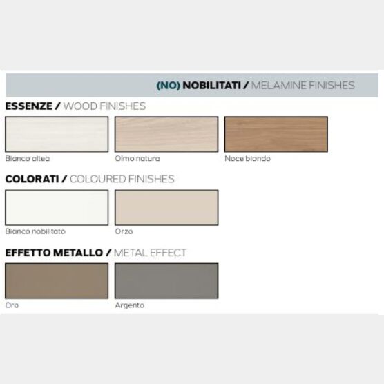 Finiture disponbili: Bianco Essenza, Olmo Natura, Noce biondo, Bianco nobilitato, Orzo, Bronzo, Bianco Lucido e Grigio Argento