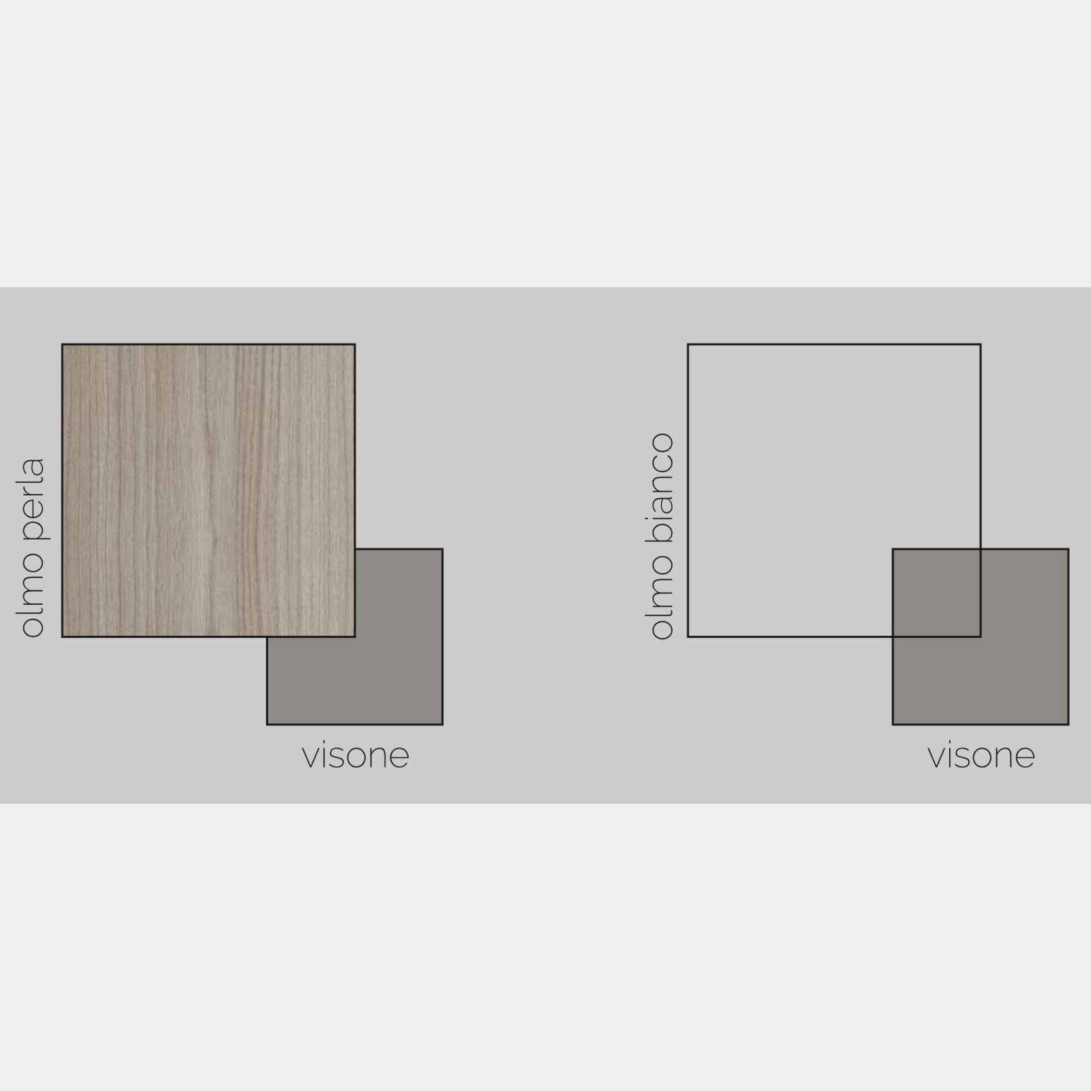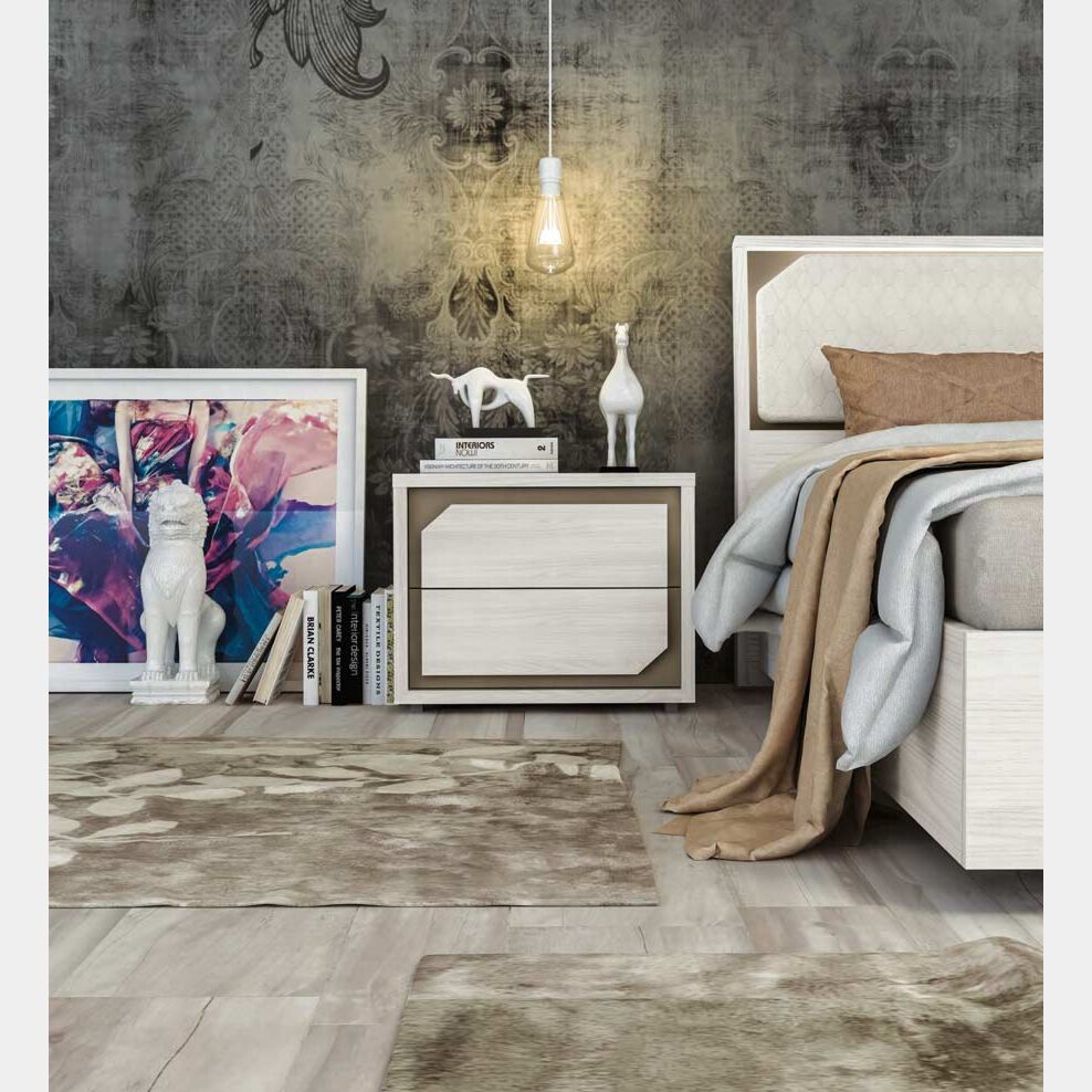 Coppia di comodini in finitura Olmo Bianco con dettagli color Visone, 100% Made in Italy. I comodini di design moderni fanno parte della Collezione Sabbia e hanno due cassetti, frontali e struttura color olmo bianco e dettagli color visone.