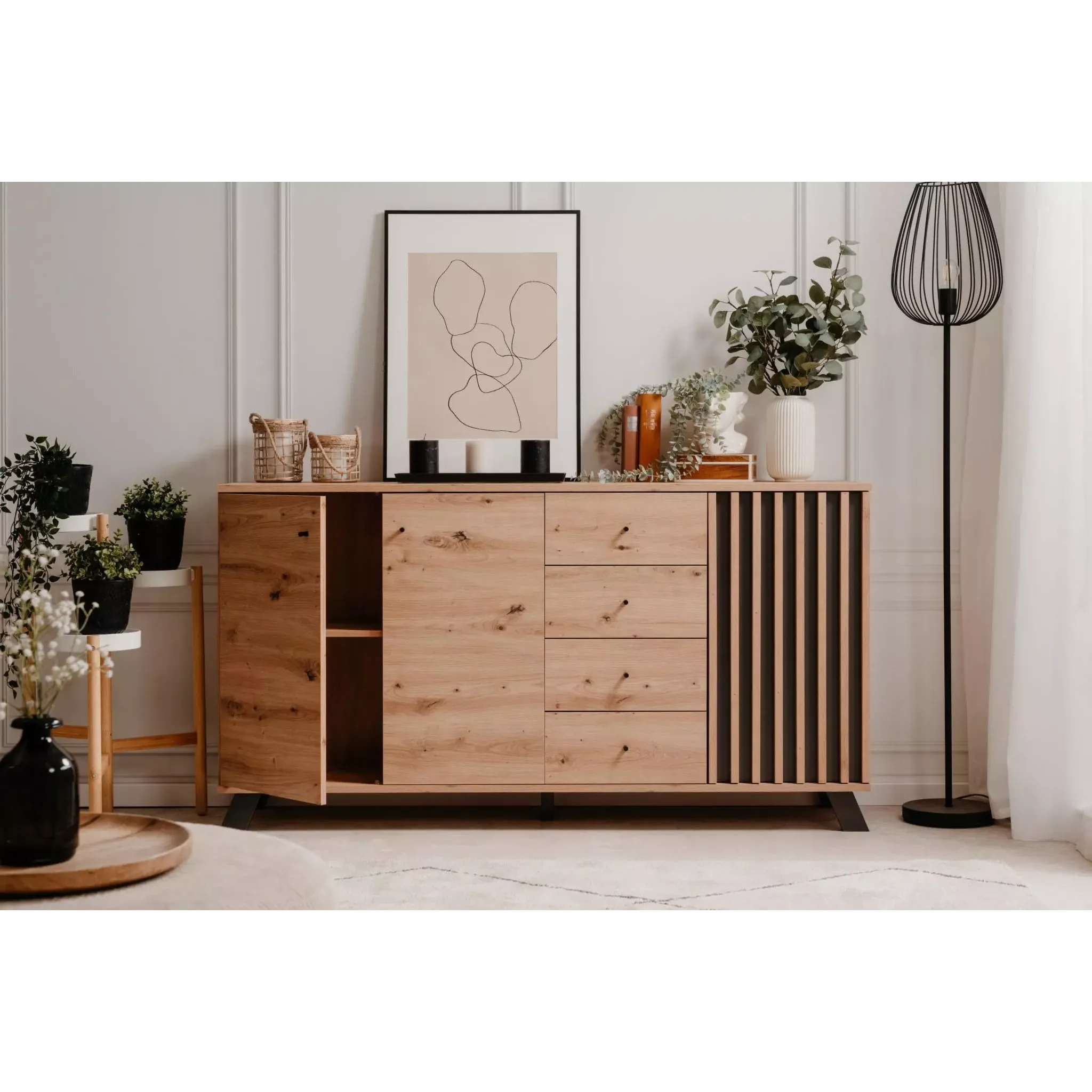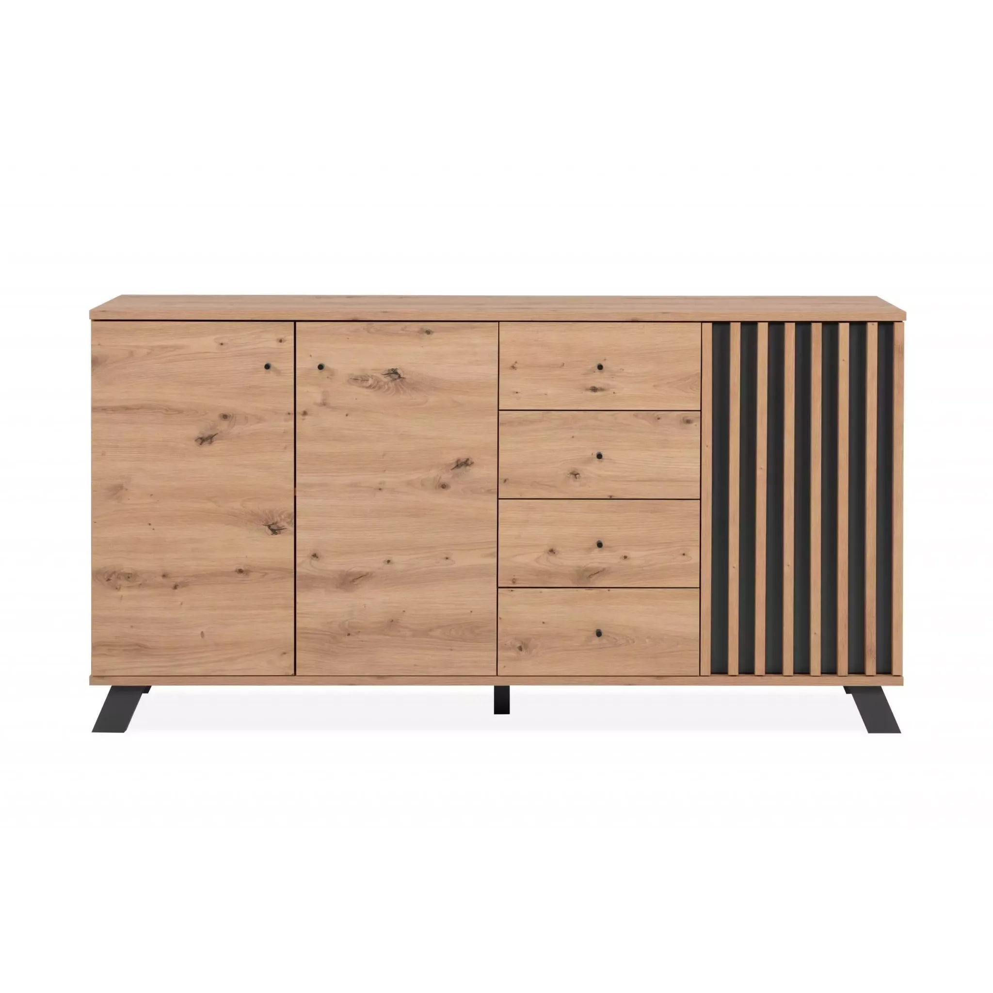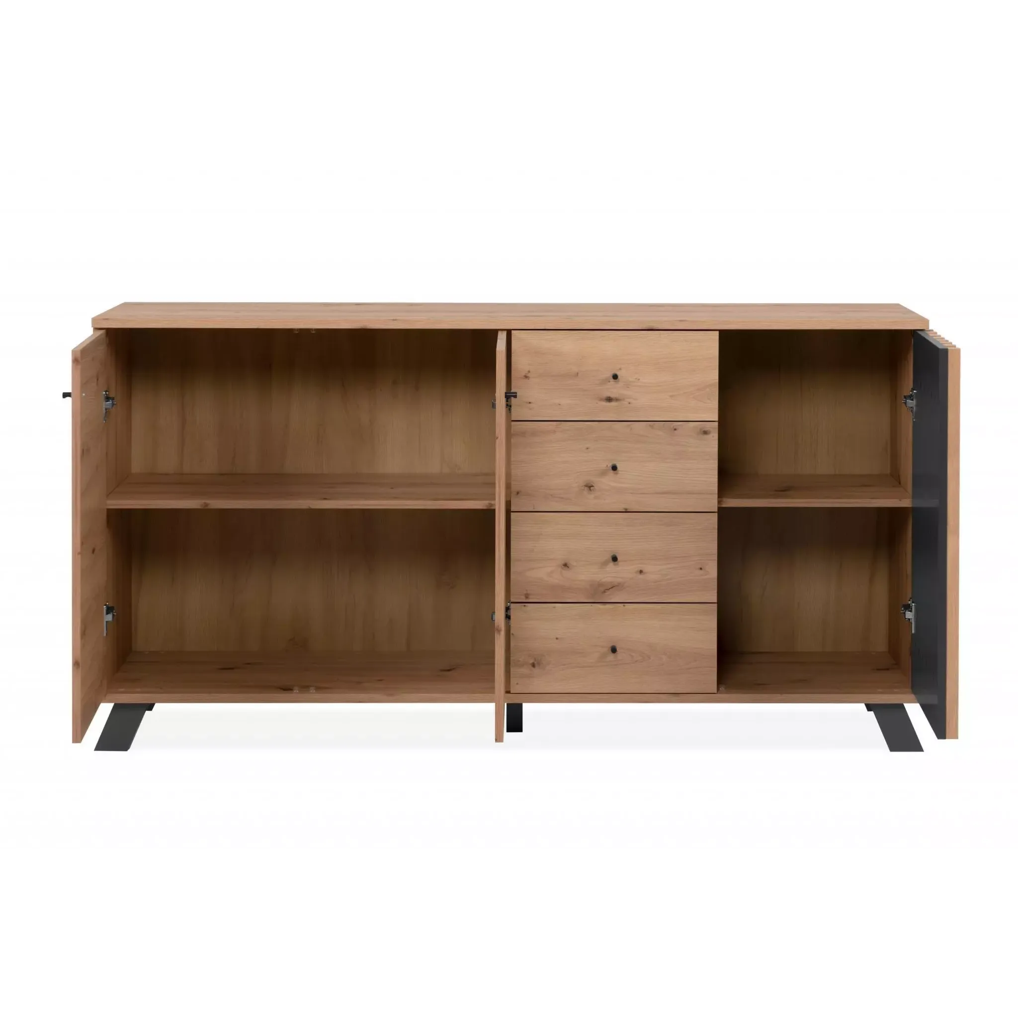 La credenza moderna Rovere Oak e Antracite è una comoda soluzione dotata di 3 ante battenti e ben 4 cassetti.