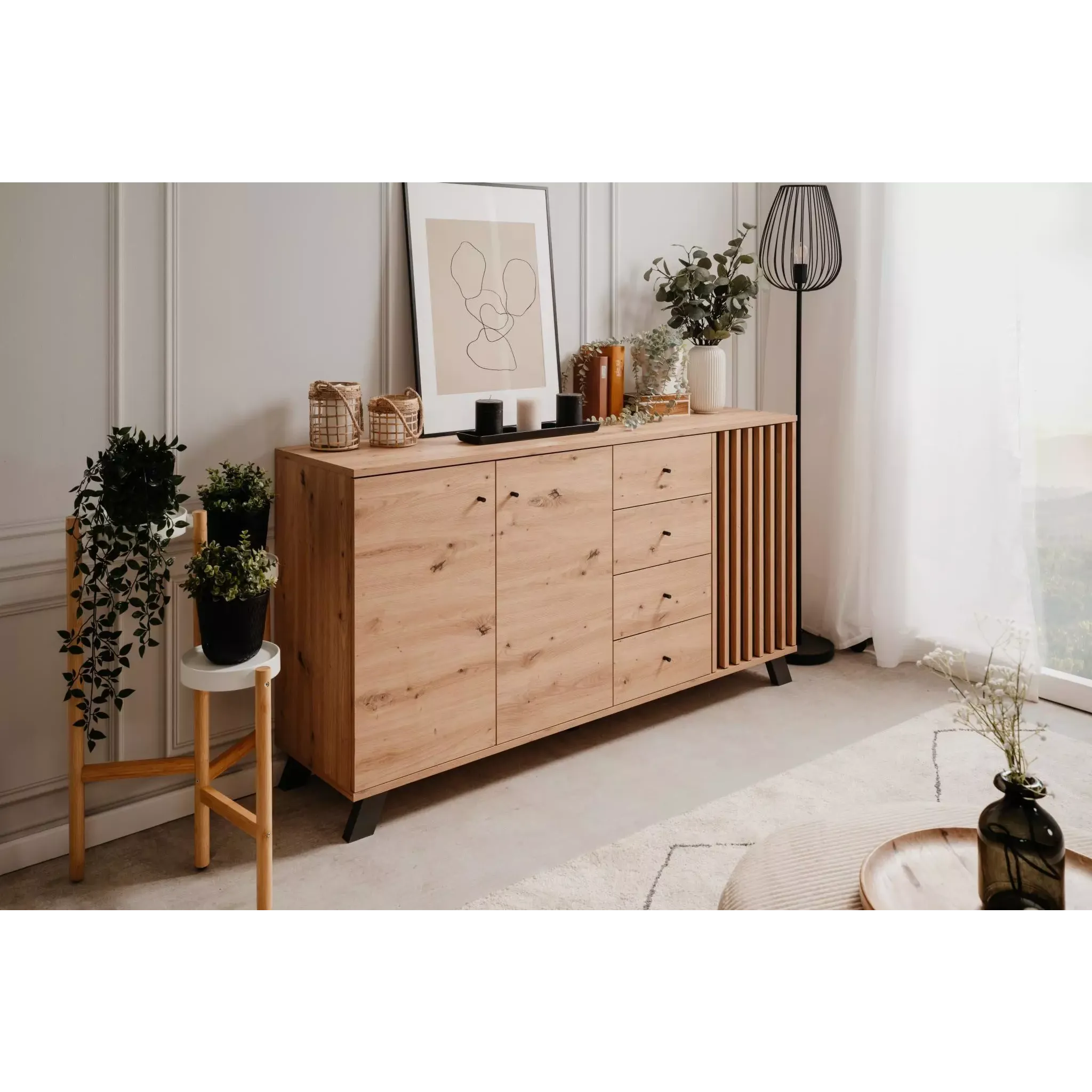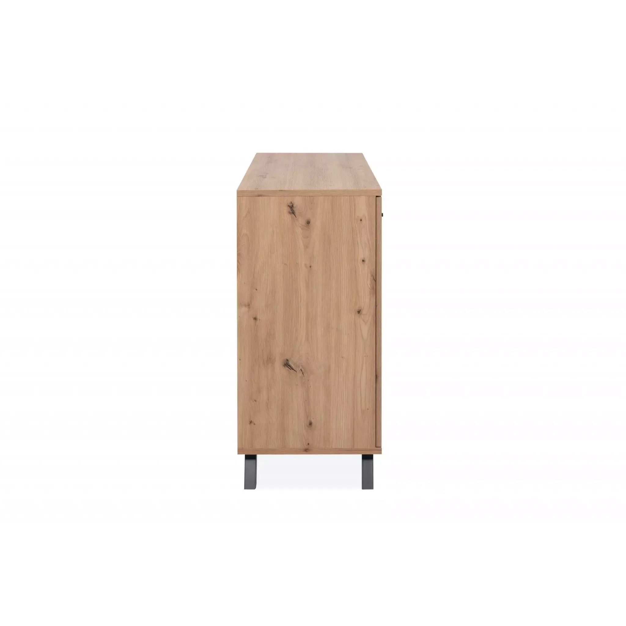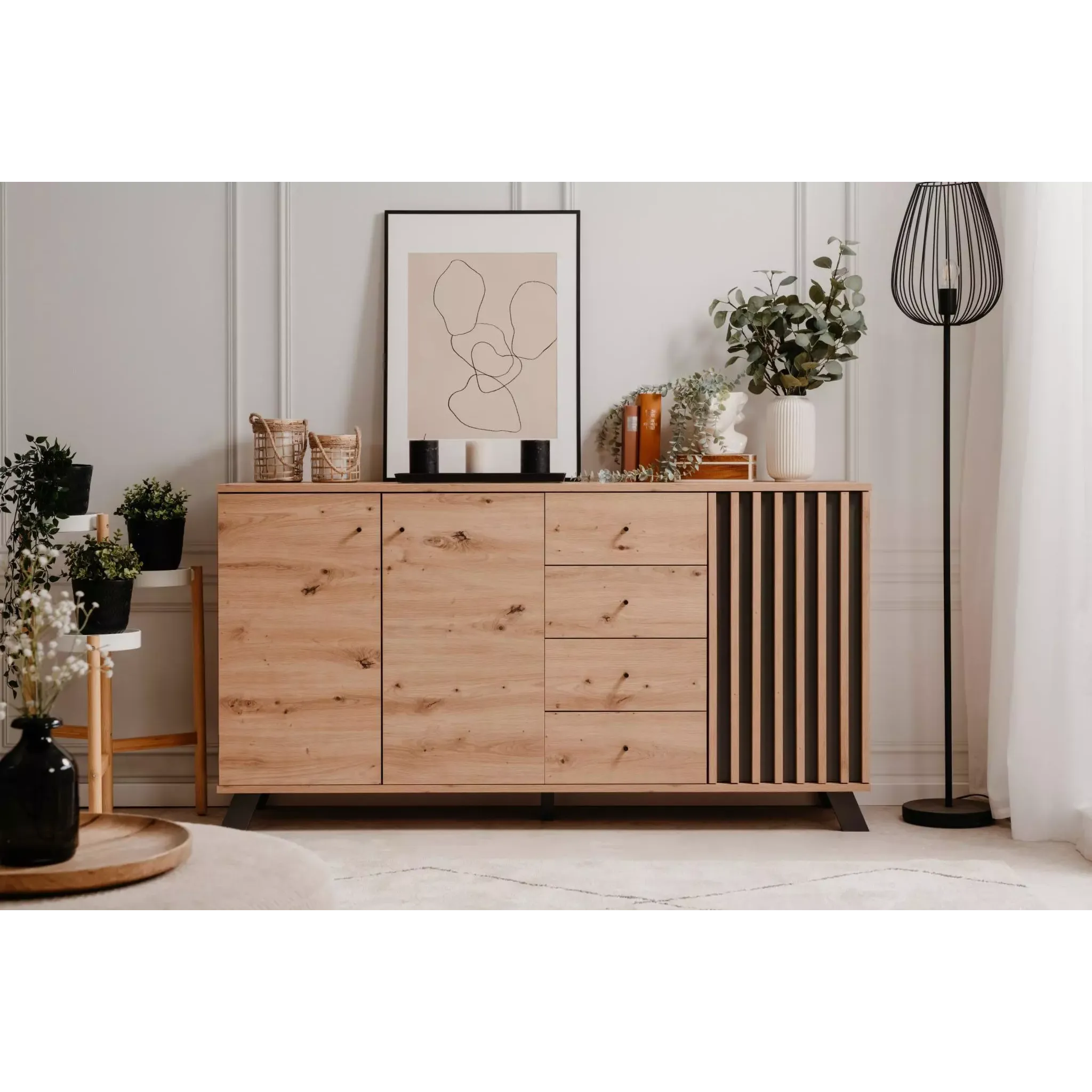 La credenza moderna Rovere Oak e Antracite è una comoda soluzione dotata di 3 ante battenti e ben 4 cassetti.
