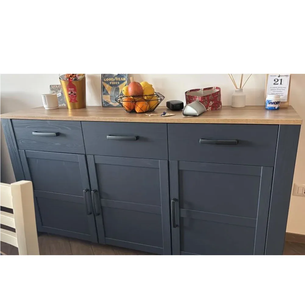 La credenza presenta 3 ante dotate di chisura ammortizzata e ripiano interno centrale e 3 pratici cassetti. Le maniglie sono in plastica nera.