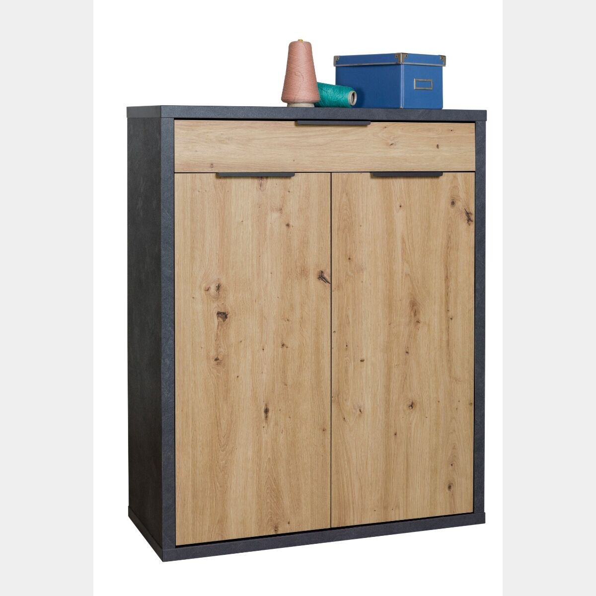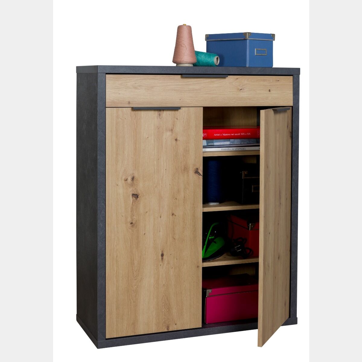 Credenza alta con 2 ante e 1 cassetto, Rovere chiaro e Grigio smoke