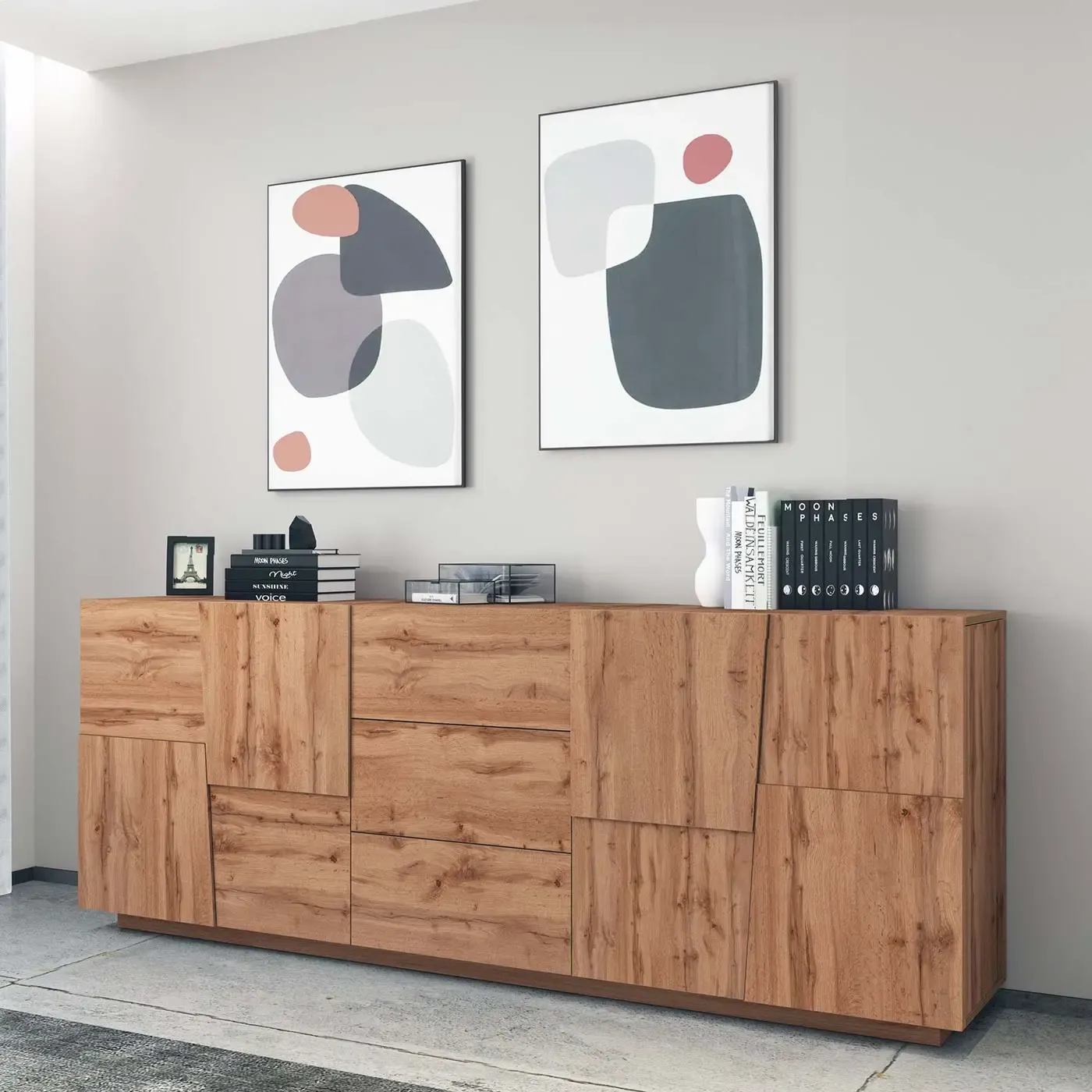 La credenza combina design e alta funzionalità. Con la sua imponente presenza e la varietà di colori disponibili, come il Rovere wotan, la madia riesce ad aggiungere un tocco di eleganza e versatilità, garantendo un equilibrio perfetto tra estetica e praticità.
