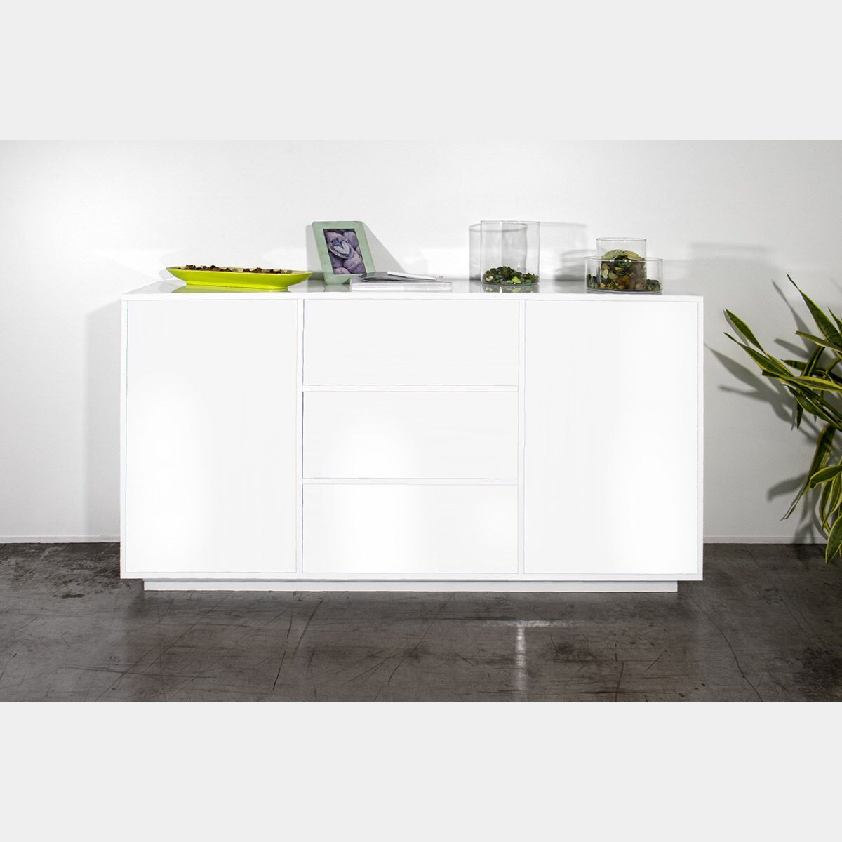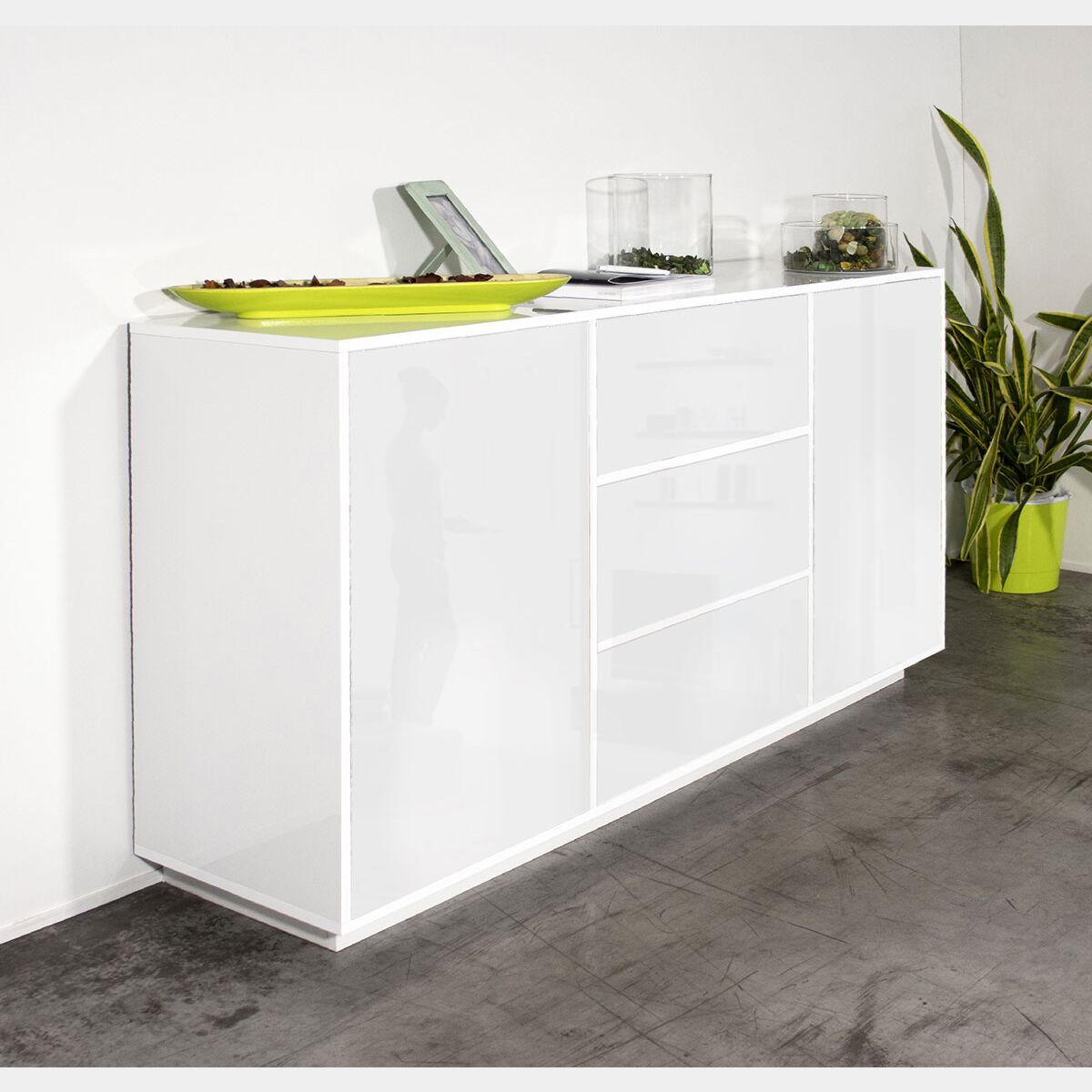 Credenza e madia moderna bianca laccata lucida, tre cassetti e due ante