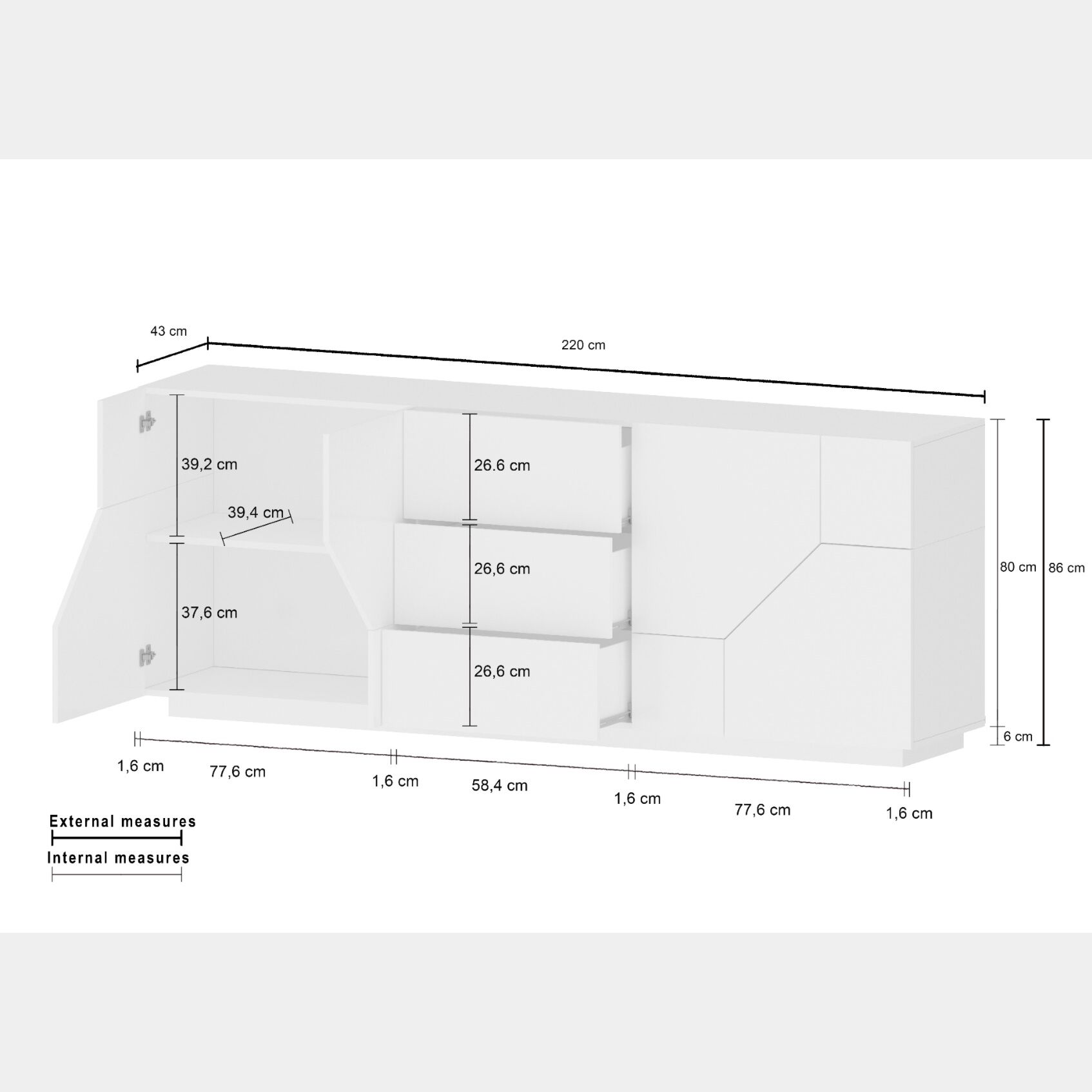 Questa Madia moderna è composta da 4 ante battenti e 3 cassetti centrali, offrendoti tutto lo spazio necessario per ordinare i tuoi oggetti di uso quotidiano.