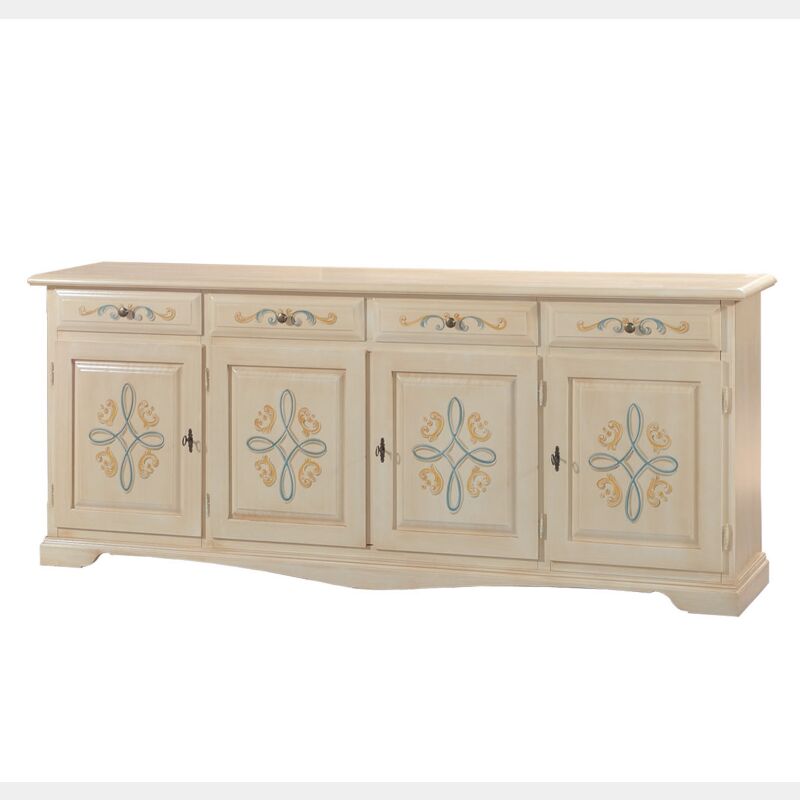 Disponibile in avorio pennellato con decori, questa credenza è corredata di 4 porte e 4 cassetti.