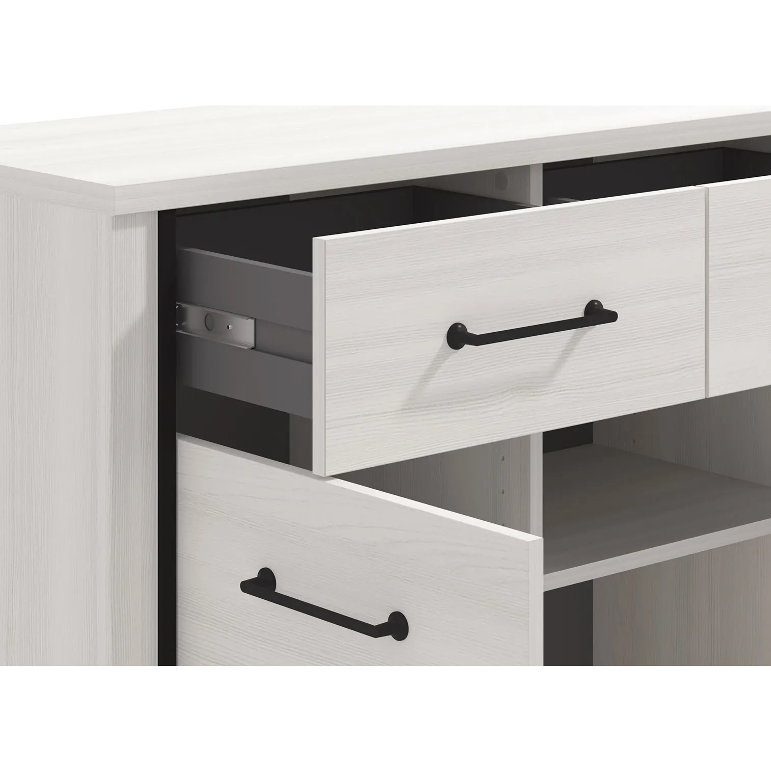 Tinte a contrasto caratterizzano la madia, assicurando un arredo personale e di sicuro impatto; la credenza presenta scocca e frontali Bianco frassino, mentre maniglie e gambe in metallo sono nere.