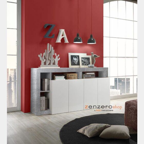 Credenza Madia a 4 ante con un ripiano in finitura bianco laccato lucido e Cemento