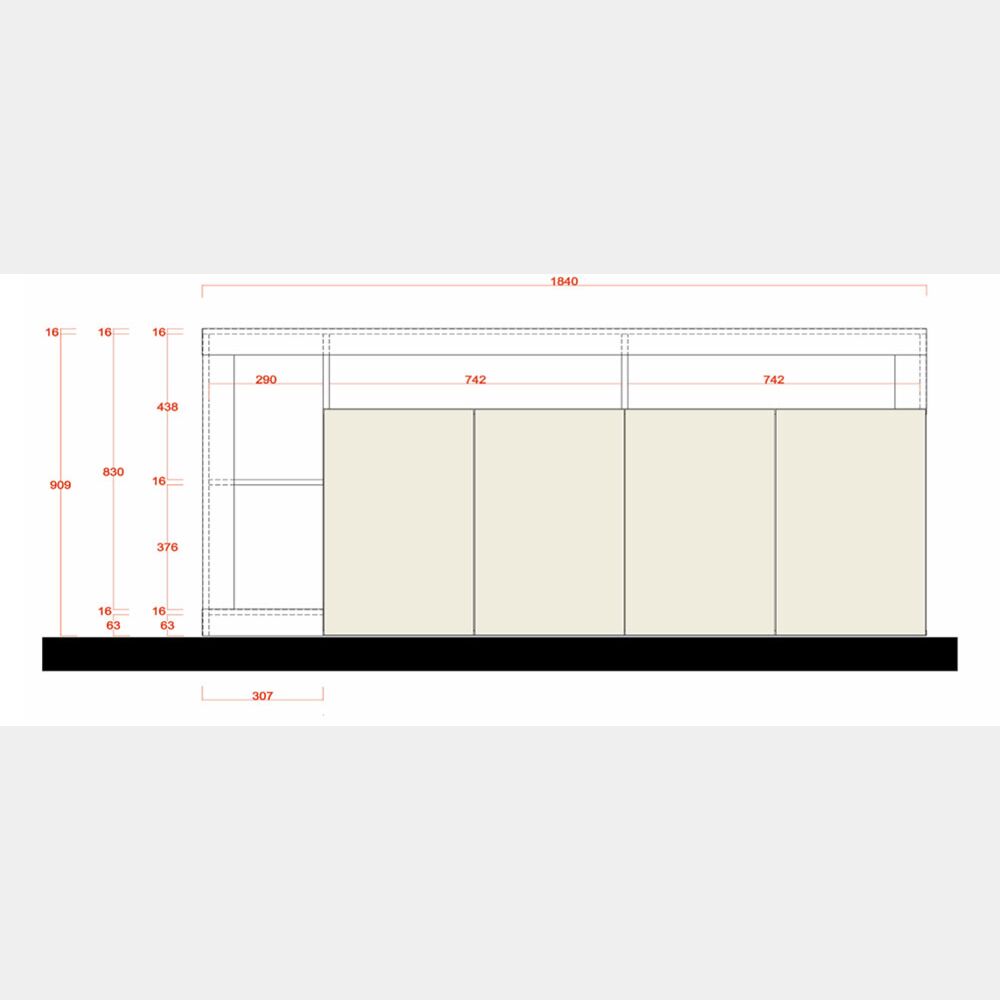 La madia è composta da 4 ante, è presente un ripiano ad ogni coppia di ante, grazie alla struttura Cemento sono presenti 2 divisori che creano 2 vani e un ripiano. Fornisce quindi molto spazio per riporre oggetti senza rinunciare alla comodità.