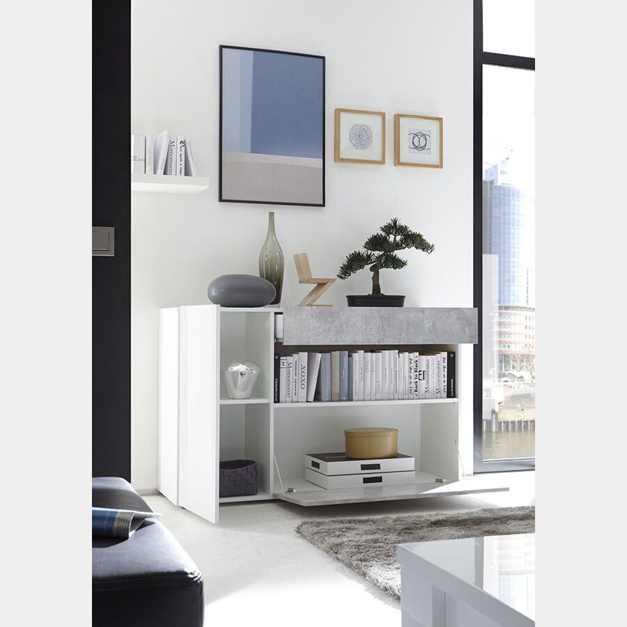 Scocca bianca, 1 anta verticale bianco lucido, cassetto e anta ribalta in finitura Beton.