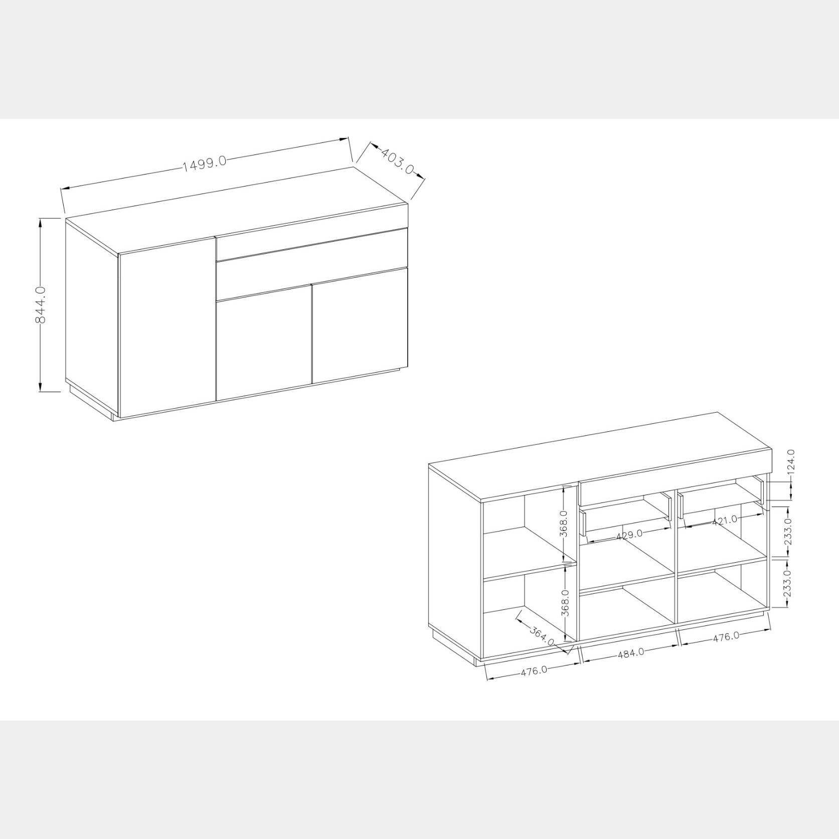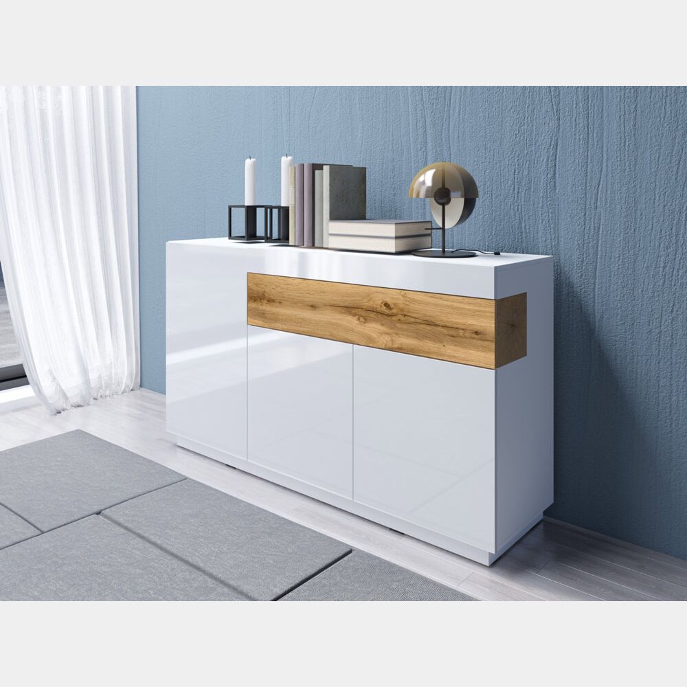 Credenza moderna 3 ante e 1 cassetto, bianco lucido e rovere naturale