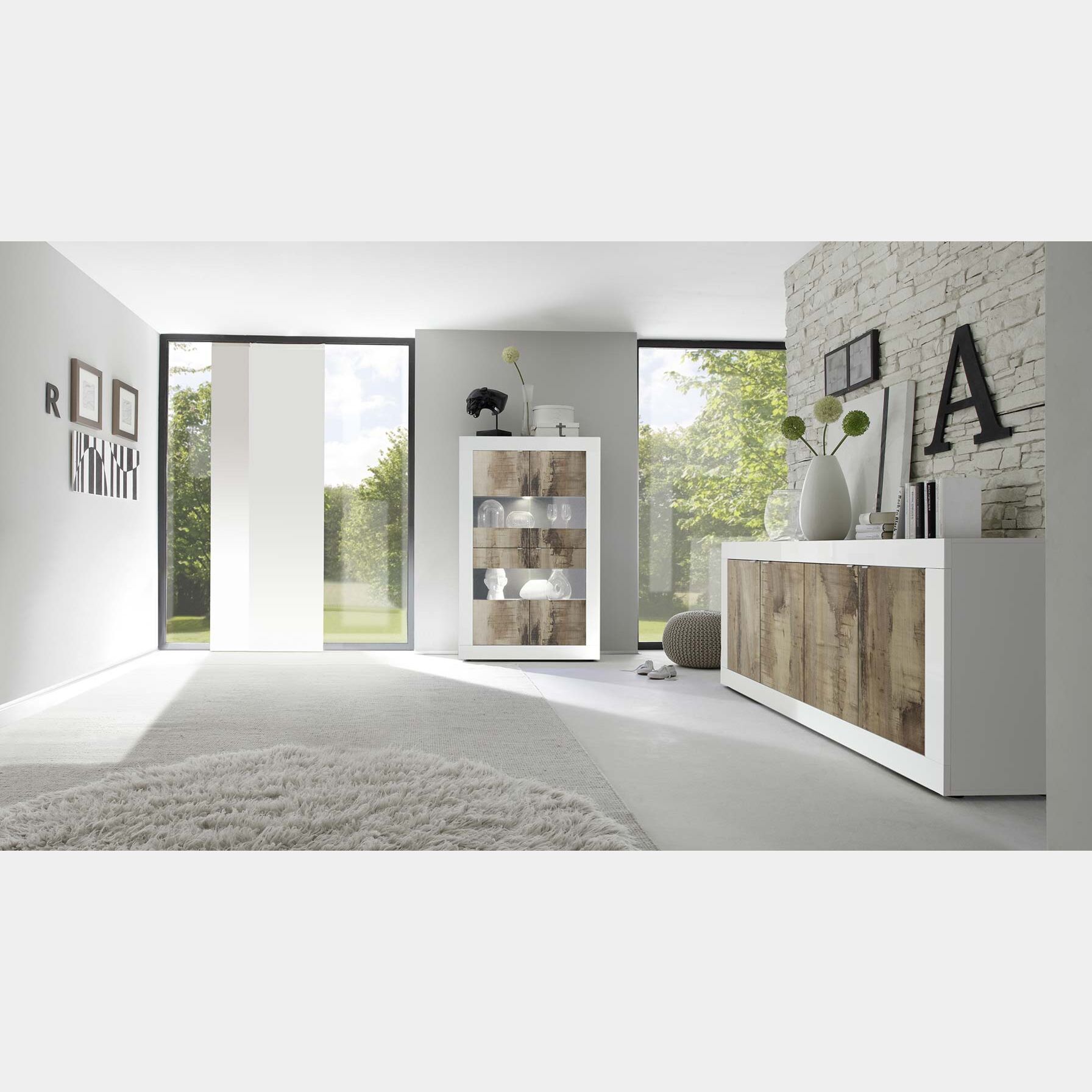 Credenza moderna di design con 4 ante in finitura bianco lucido e pero.