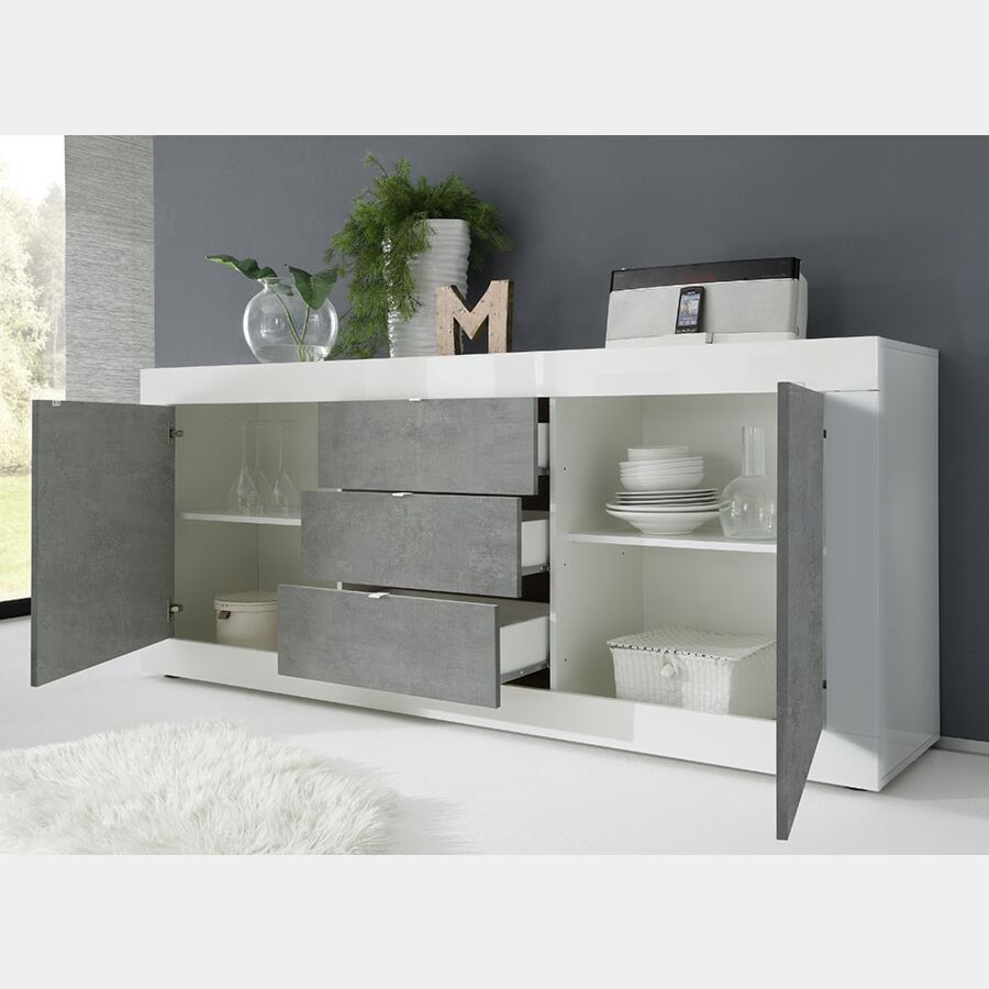 Realizzata in melaminico e con una finitura legno di alta qualità, questa madia dalla linea moderna e attuale viene proposta con una finitura in pregiato laccatura bianco lucido e cemento.