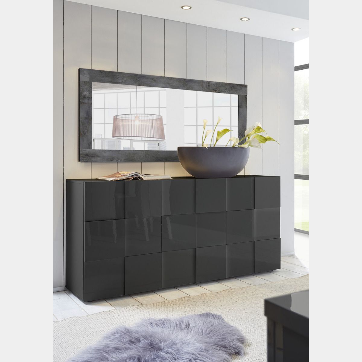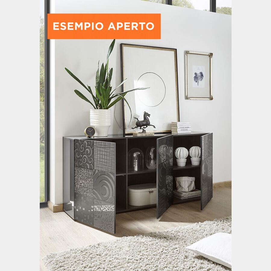 Madia a tre ante, moderna e di design, linee pulite, ampie e robuste superfici, e in finitura grigio lucido laccato, il frontalecon geometriche crea forme per creare un movimento sinuoso.