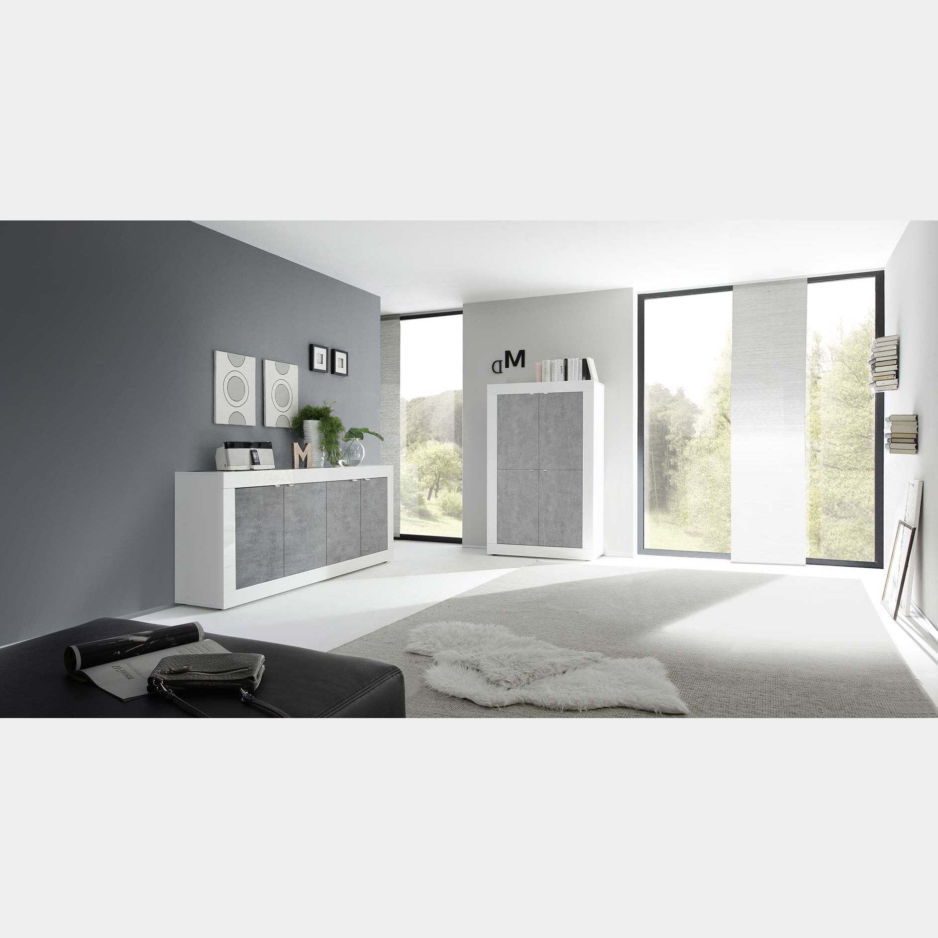 Credenza Moderna, Madia di Design, 4 ante Alta, Bianco Lucido e Cemento