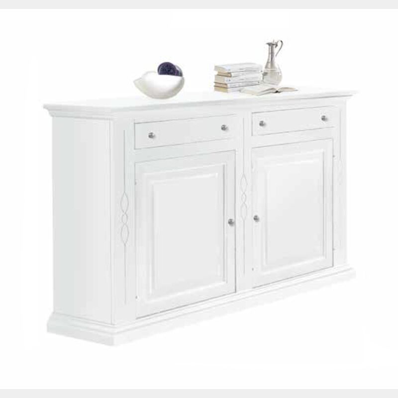 Bellissimo credenzone in legno, bianco opaco, arte povera: sobria e moderna, presenta una linea che può essere abbinata sia ad un ambiente classico che a uno moderno. Corredata di due ante e due cassetti.