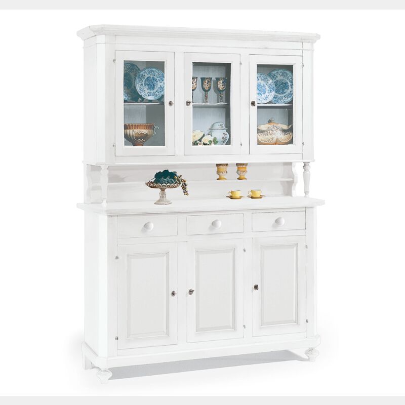 Splendida cristalliera in legno finitura laccato bianco opaco a cappello dritto. Di costruzione robusta e di prestigio, con 3 ante a vetro, chiuse da serrature anticate e vano a giorno centrale. La parte inferiore composta da 3 porte, con chiusura da serrature anticate e 3 cassetti.