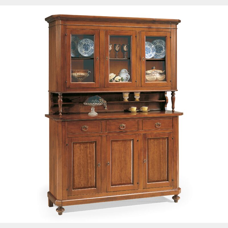 Splendida cristalliera in legno finitura lucido noce a cappello dritto. Di costruzione robusta e di prestigio, con 3 ante a vetro, chiuse da serrature anticate e vano a giorno centrale. La parte inferiore composta da 3 porte, con chiusura da serrature anticate e 3 cassetti.