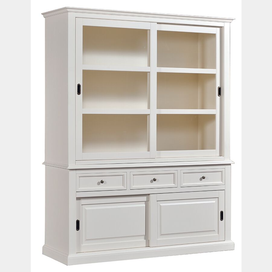 Cristalliera dal design classico/moderno. La parte inferiore è formata da due porte scorrevoli e 3 ampi cassetti mentre la parte superiore con due ampie porte scorrevoli a vetro. Ripiani inclusi. Finitura laccata avorio.