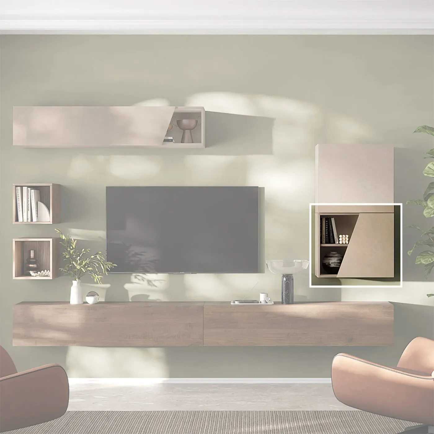 Il cubo è proposto nella finitura Argilla; l'ampio campionario disponibile assicura una completa personalizzazione del pensile, per adattarlo al meglio ai propri gusti.