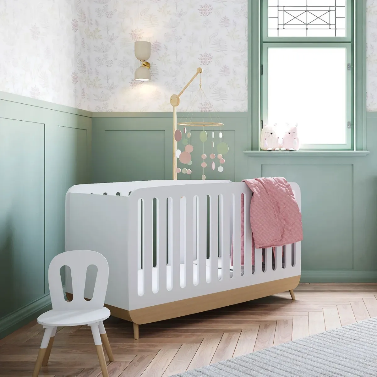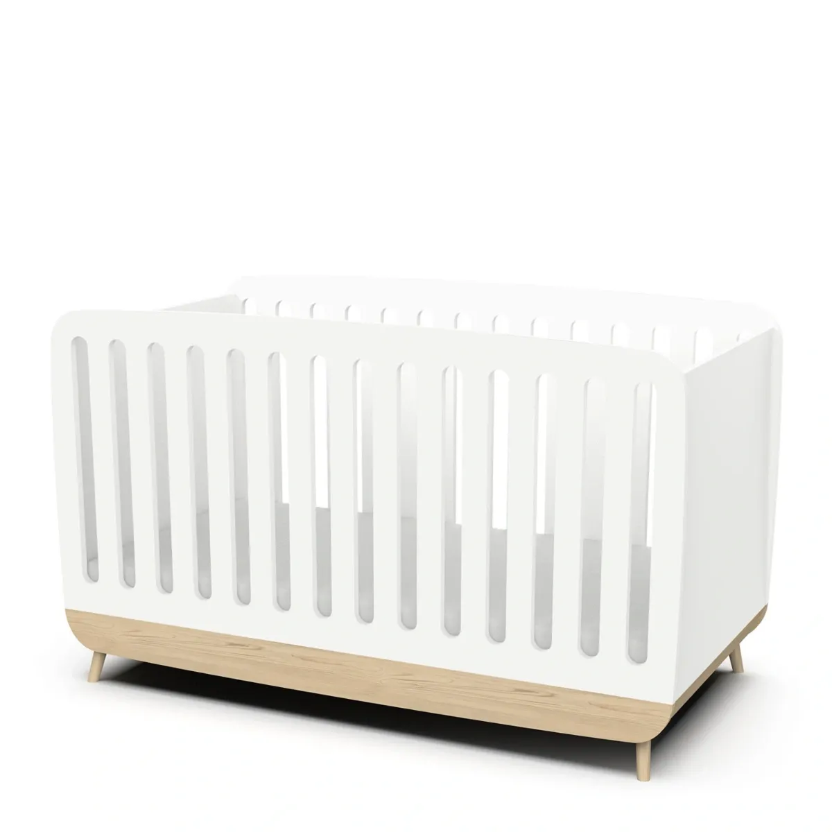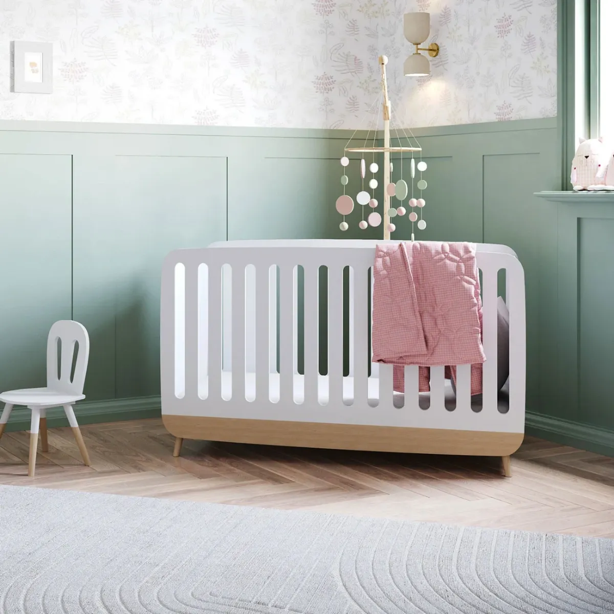 La culla Dory è proposta in due finiture: Bianco e Rovere. L'accostamento delle due tinte genera armonia e calore, assicurando alla cameretta uno stile elegante e moderno.