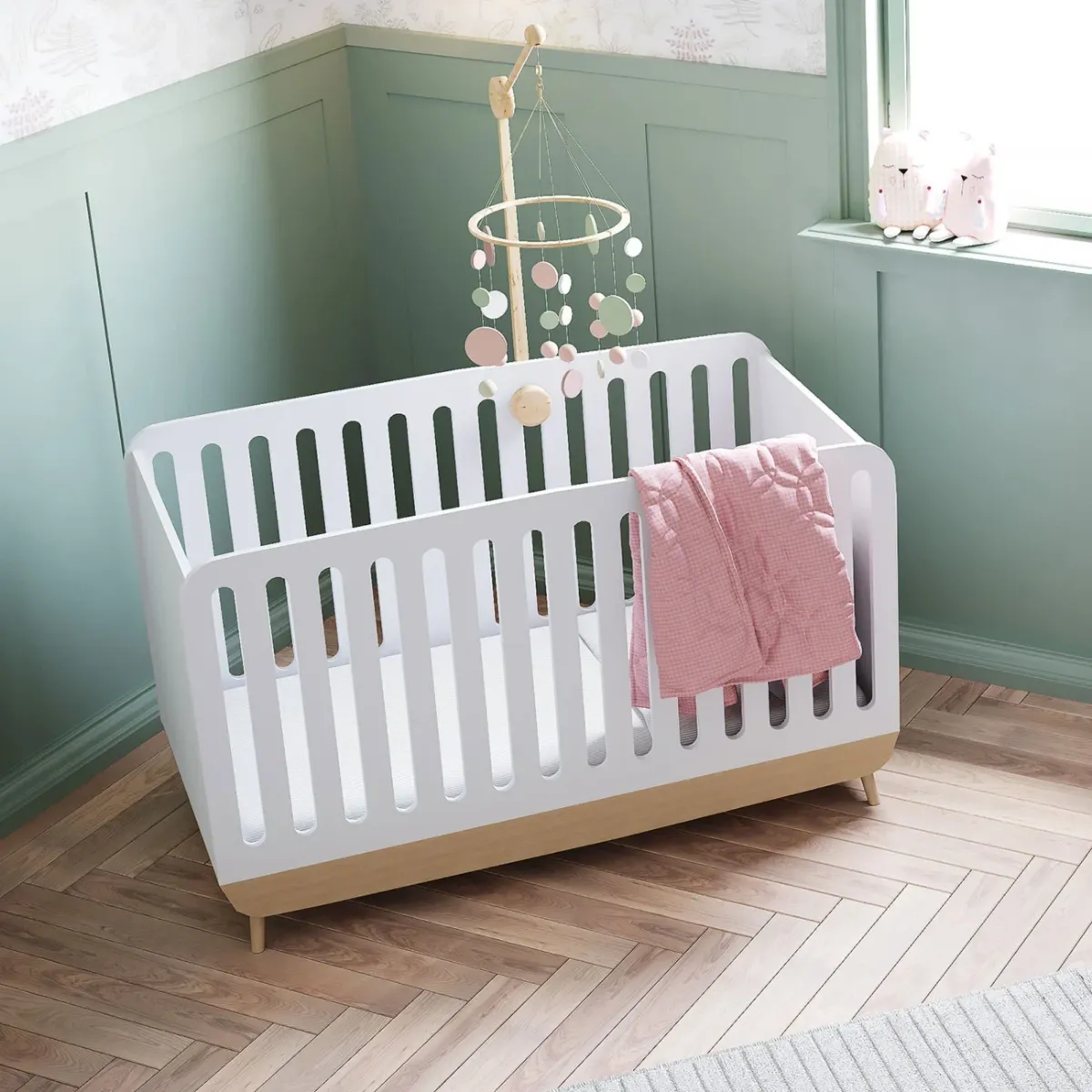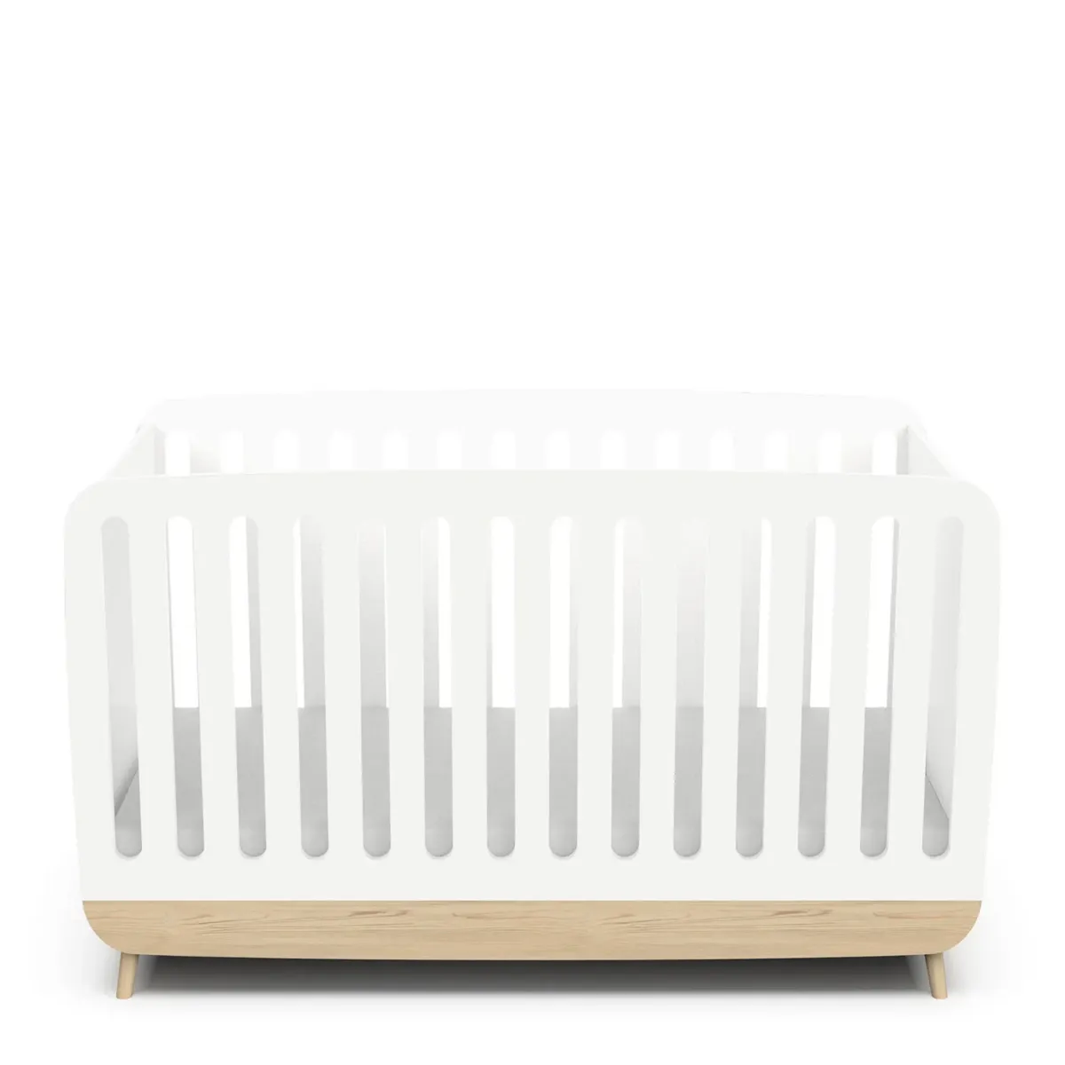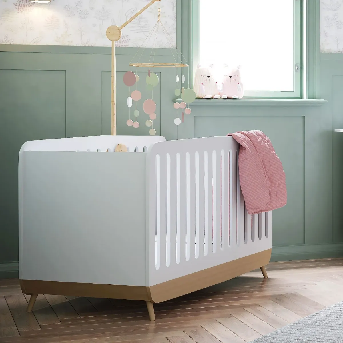 La culla Dory è proposta in due finiture: Bianco e Rovere. L'accostamento delle due tinte genera armonia e calore, assicurando alla cameretta uno stile elegante e moderno.
