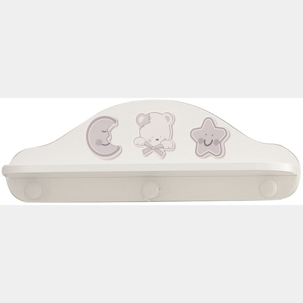 La mensola è dotata di schienale bianco con decori grigi e tre pomelli per appendere indumenti.