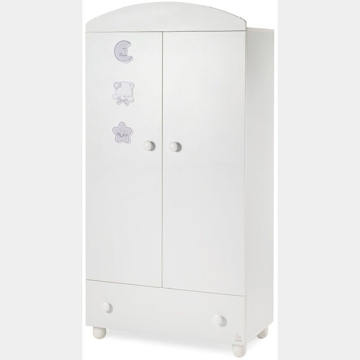Questo armadio ti permetterà di ordinare e organizzare facilmente i vestiti del tuo piccolo grazie al lato guardaroba e al comodo cassettone che scorre su guide in metallo. L'interno è realizzato con un divisorio centrale, lo spazio interno è attrezzato con due ripiani e 2 appendiabiti. Ante e cassetto sono dotati di sistema di chisura soft close. Vengono forniti i piedini regolabili. L'armadio è bianco con cassetto grigio e decori in tinta in rilievo nella parte superiore. Eventuali ripiani aggiuntivi sono disponibili a richiesta.