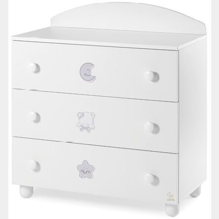 Il comò è dotato di tre cassetti con maniglie, le guide sono in metallo. Il comò è in finitura Bianco con cassetto inferiore grigio, i decori sono in tinta.