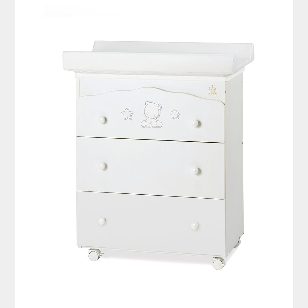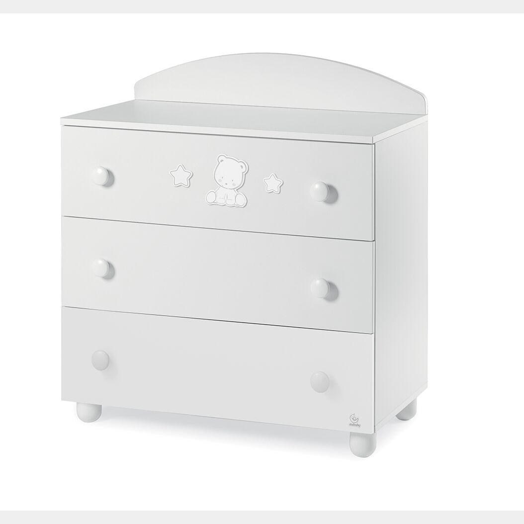 Il comò è dotato di tre cassetti con maniglie, le guide sono in metallo. Il comò è in finitura Bianco, nel primo cassetto sono inseriti tre decori tortora (o grigi).