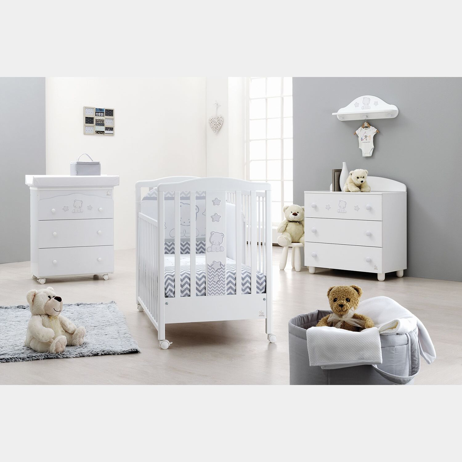 La culla Teddy è realizzata in massello di faggio, le sponde, a norma di sicurezza, sono rivestite con guaina gengivale in materiale plastico atossico. Con le spondine nella posizione alta il lettino diventa un luogo sicuro dove far dormire il bambino, evitando cadute accidentali.