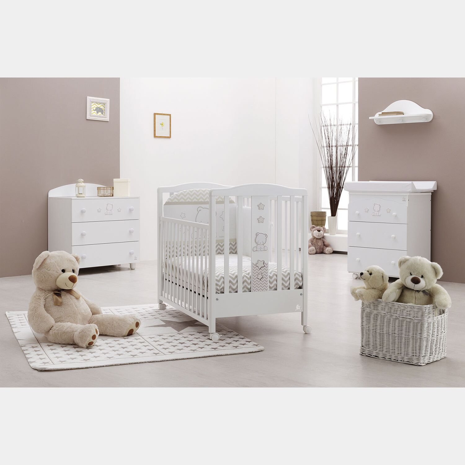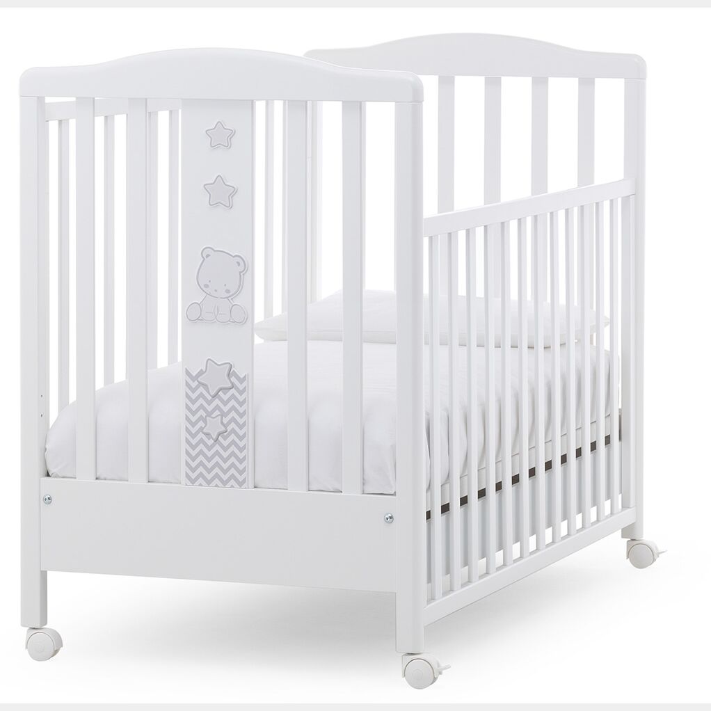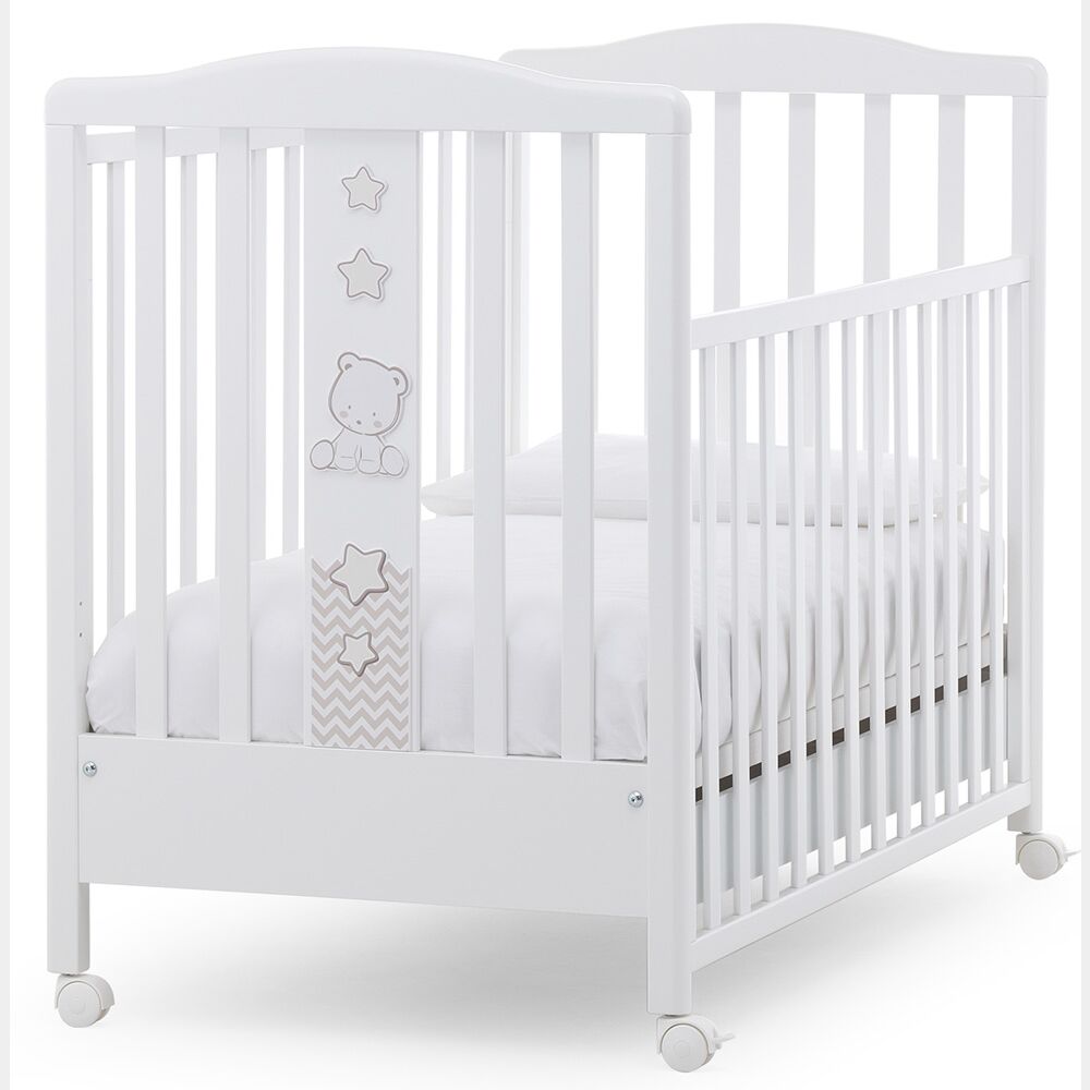 Culla moderna Teddy con ruote, bianca con decori Tortora