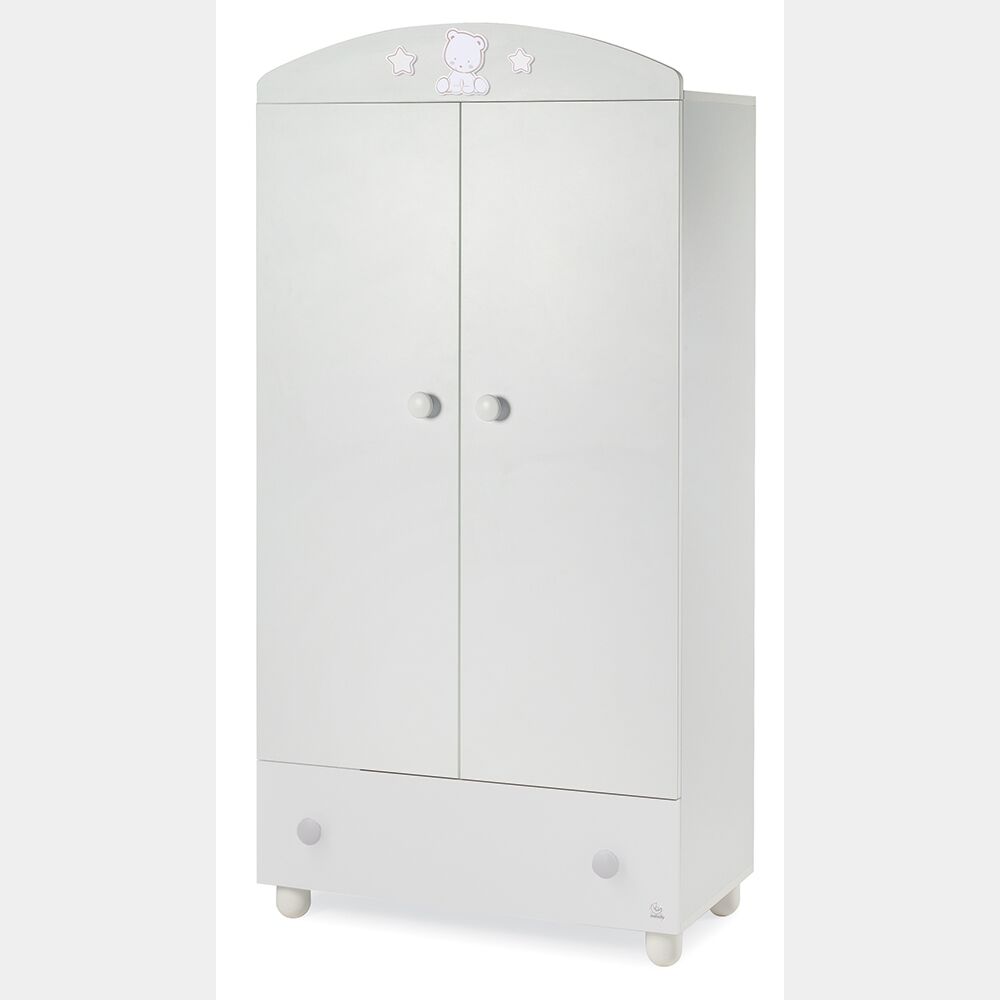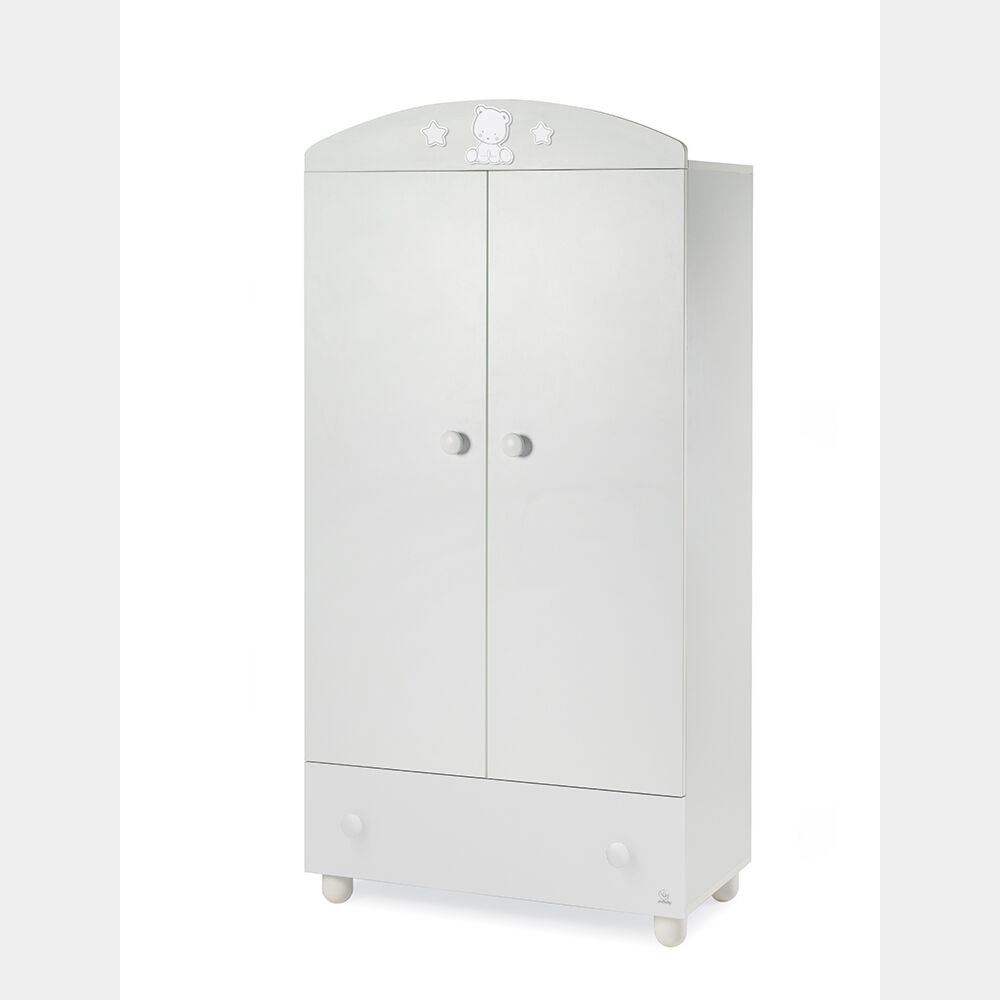 Questo armadio ti permetterà di ordinare e organizzare facilmente i vestiti del tuo piccolo grazie al lato guardaroba e al comodo cassettone che scorre su guide in metallo. L'interno è realizzato con un divisorio centrale, lo spazio interno è attrezzato con due ripiani e 2 appendiabiti. Ante e cassetto sono dotati di sistema di chisura soft close. Vengono forniti i piedini regolabili. L'armadio è bianco con decori in rilievo nella parte superiore. Eventuali ripiani aggiuntivi sono disponibili a richiesta.