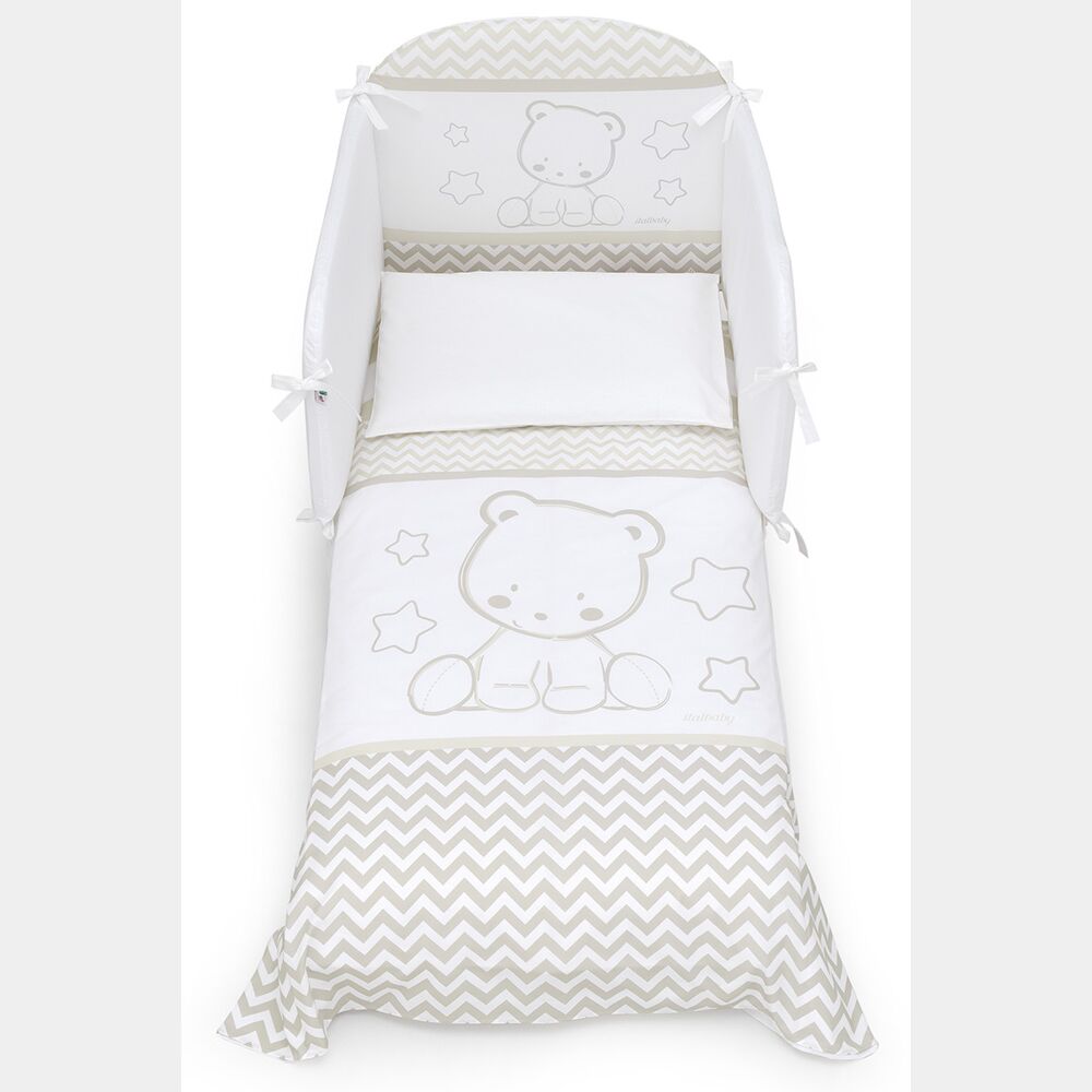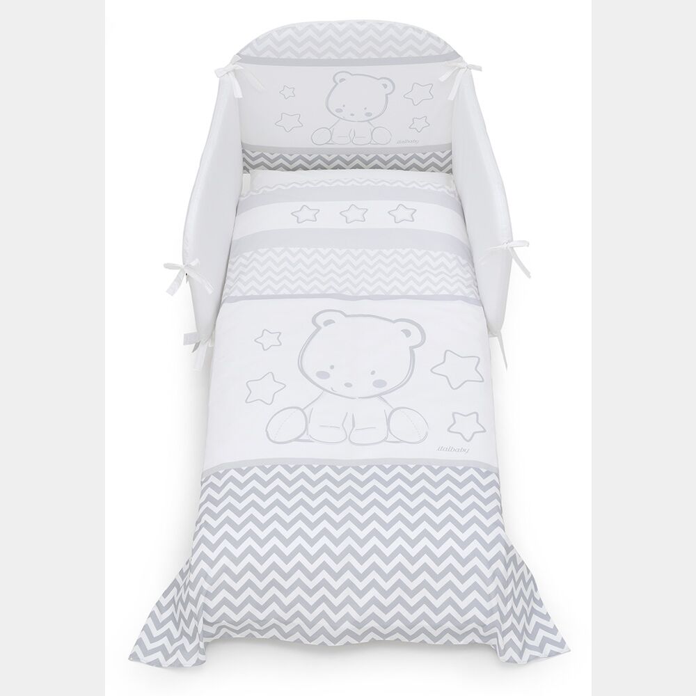 Il set piumoni sfilabile è composto da 5 elementi: federa per guanciale, paracolpi 3 lati, sacco copripiumino, 1 piumino in fibra e un lenzuolo inferiori con angoli. 100% cotone, disponibile con stampa in fantasia tortora o grigio.