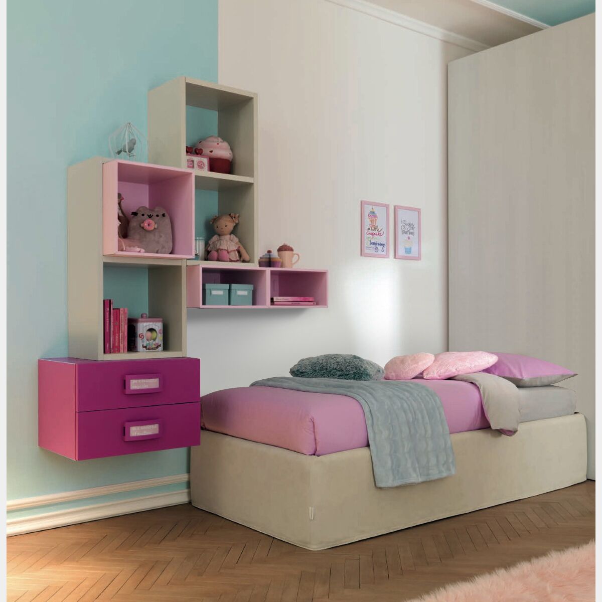 Il letto viene proposto in Tessuto Nebbia ed Ecopelle Perla, grazie alla possibilità di sostituire le finiture potrai creare una soluzione unica e originale, in perfetta armonia con lo stile della cameretta e adatta ai tuoi gusti.