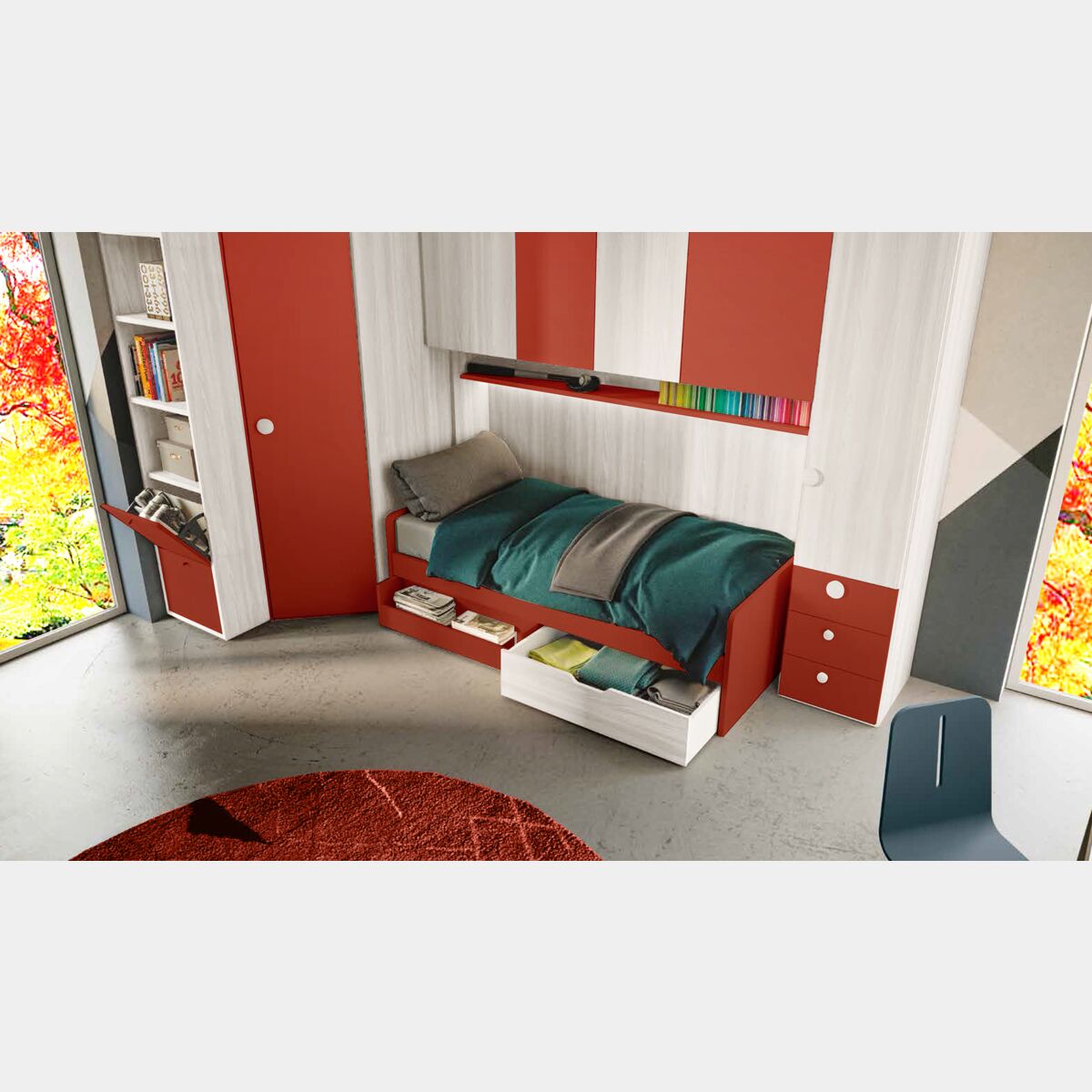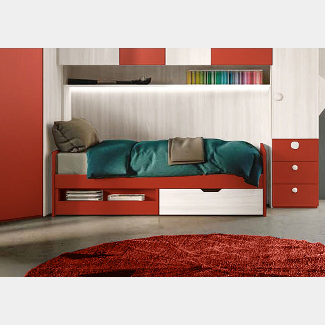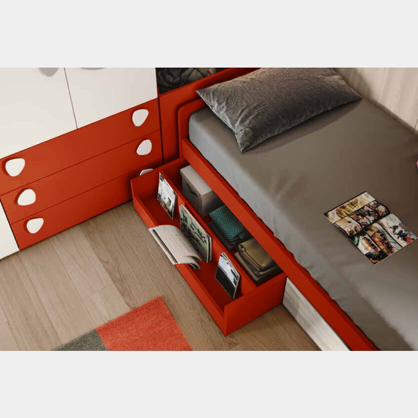 La struttura presenta un posto letto con vano da 90x190 e due cassettoni sottostanti: un cassettone diventa una pratica libreria per riporre libri e giornali, grazie alla sua suddivisione interna viene assicurato un'ampio spazio utile.