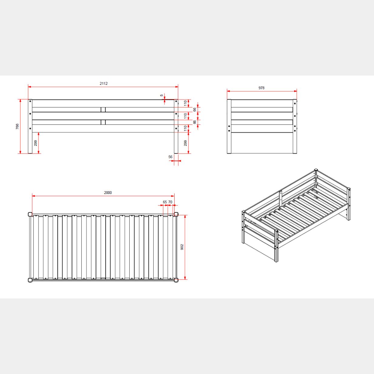 • Materiale: il letto singolo è in pino massello, disponibile in naturale o laccato bianco.