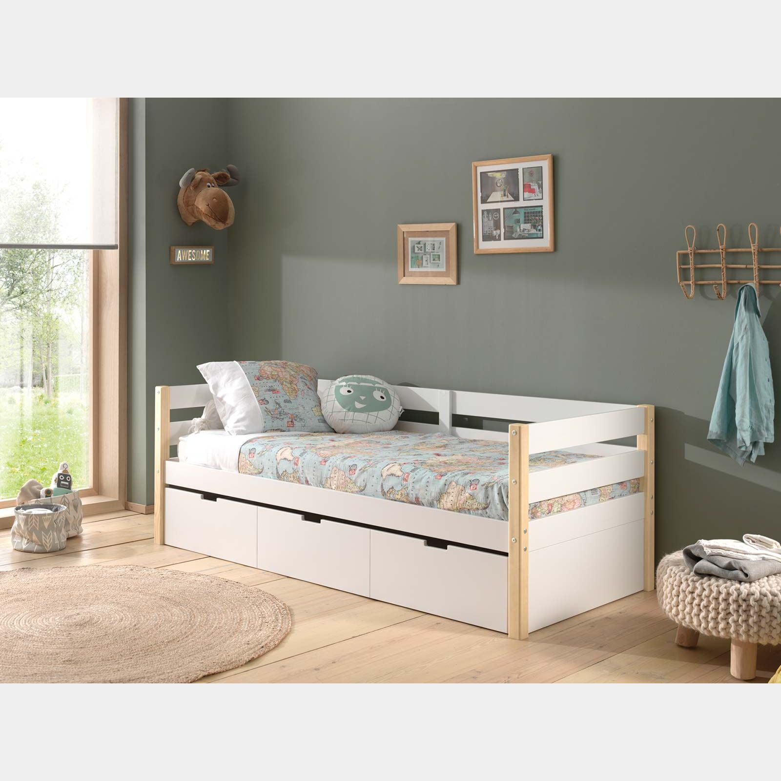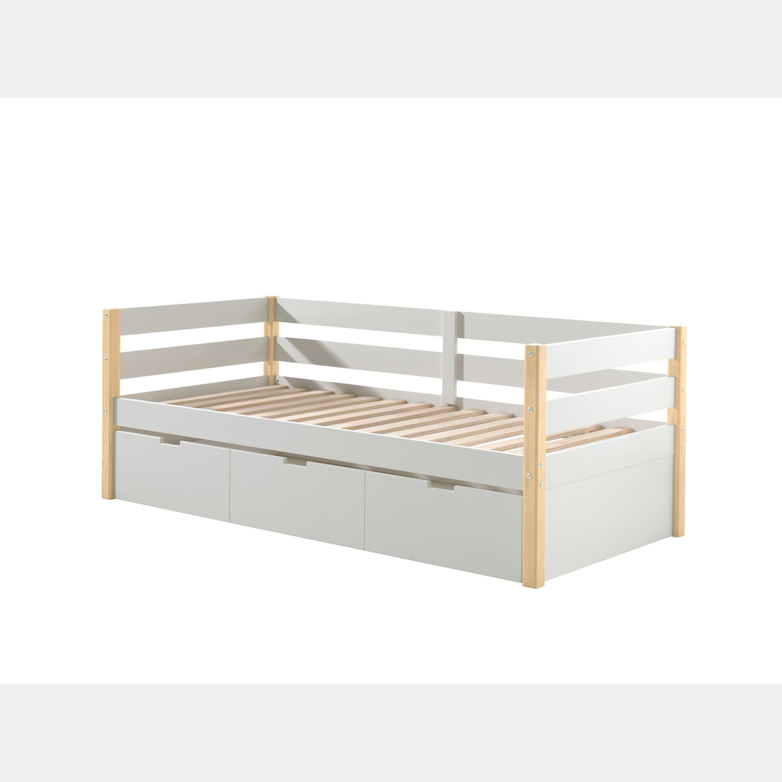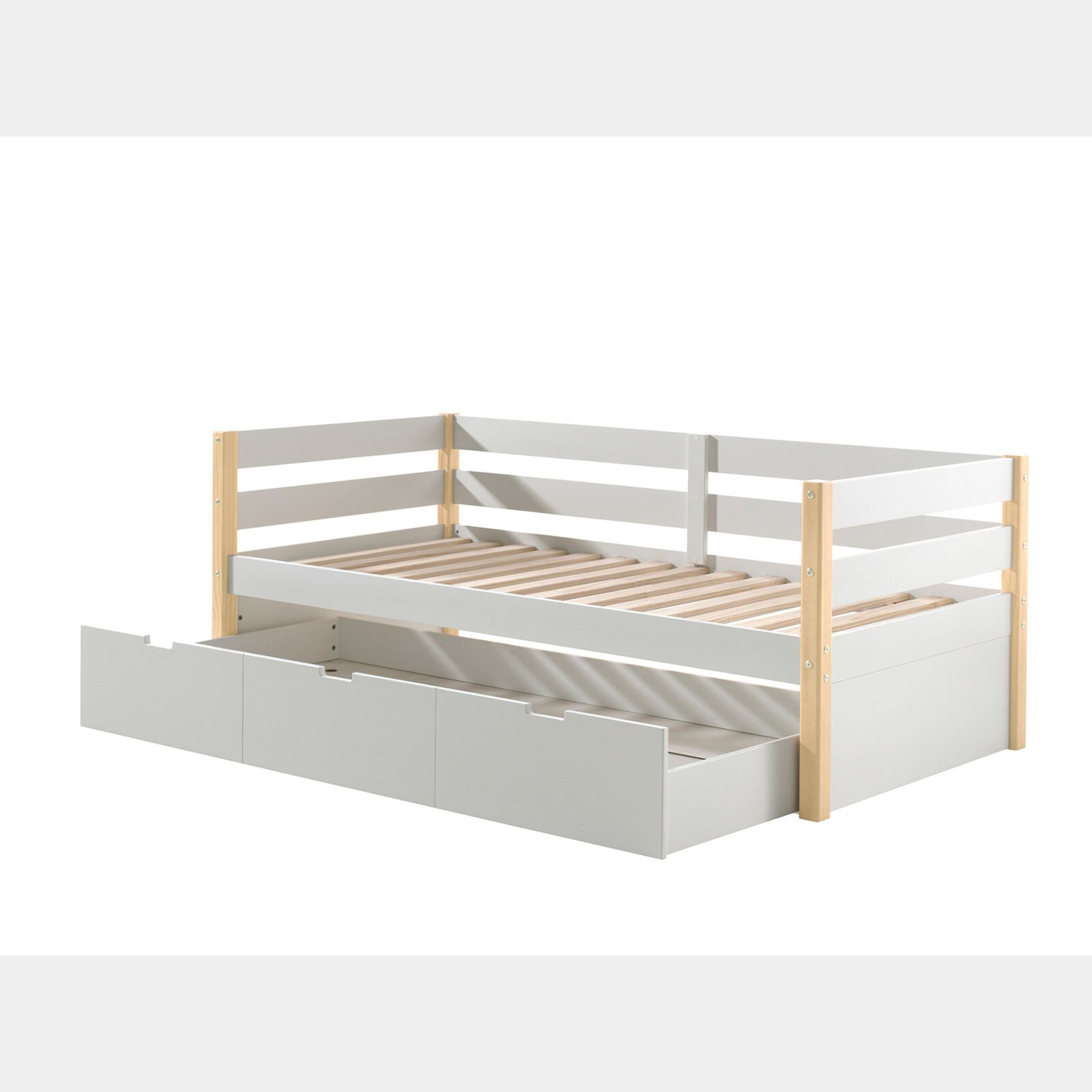 Il letto singolo può essere utilizzato sia come letto che come divano. Il bianco laccato e le tonalità naturali del pino massello conferiscono un aspetto scandinavo che consentono al letto di adattarsi a tutti gli ambienti, sia a camere che camerette.