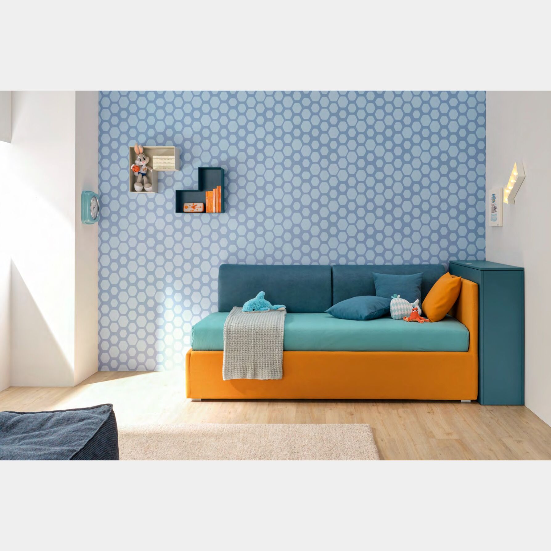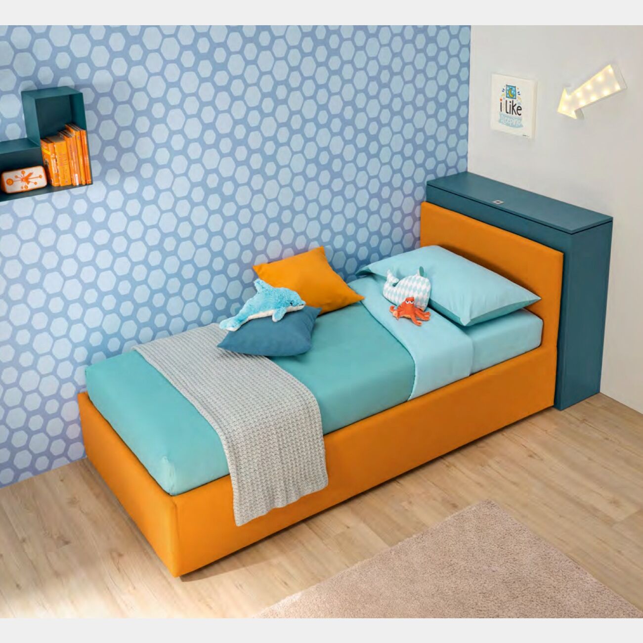 Il divano letto Delta è prosposto nella finitura in tessuto Mango, è però possibile richiederlo in altri colori per assicurare il giusto arredo ad ogni camera da letto. E' possibile richiedere il box contenitore (L.103.6 H.96 P.30) ed i due cuscini poggia schiena (L.195 H.40 P.20).