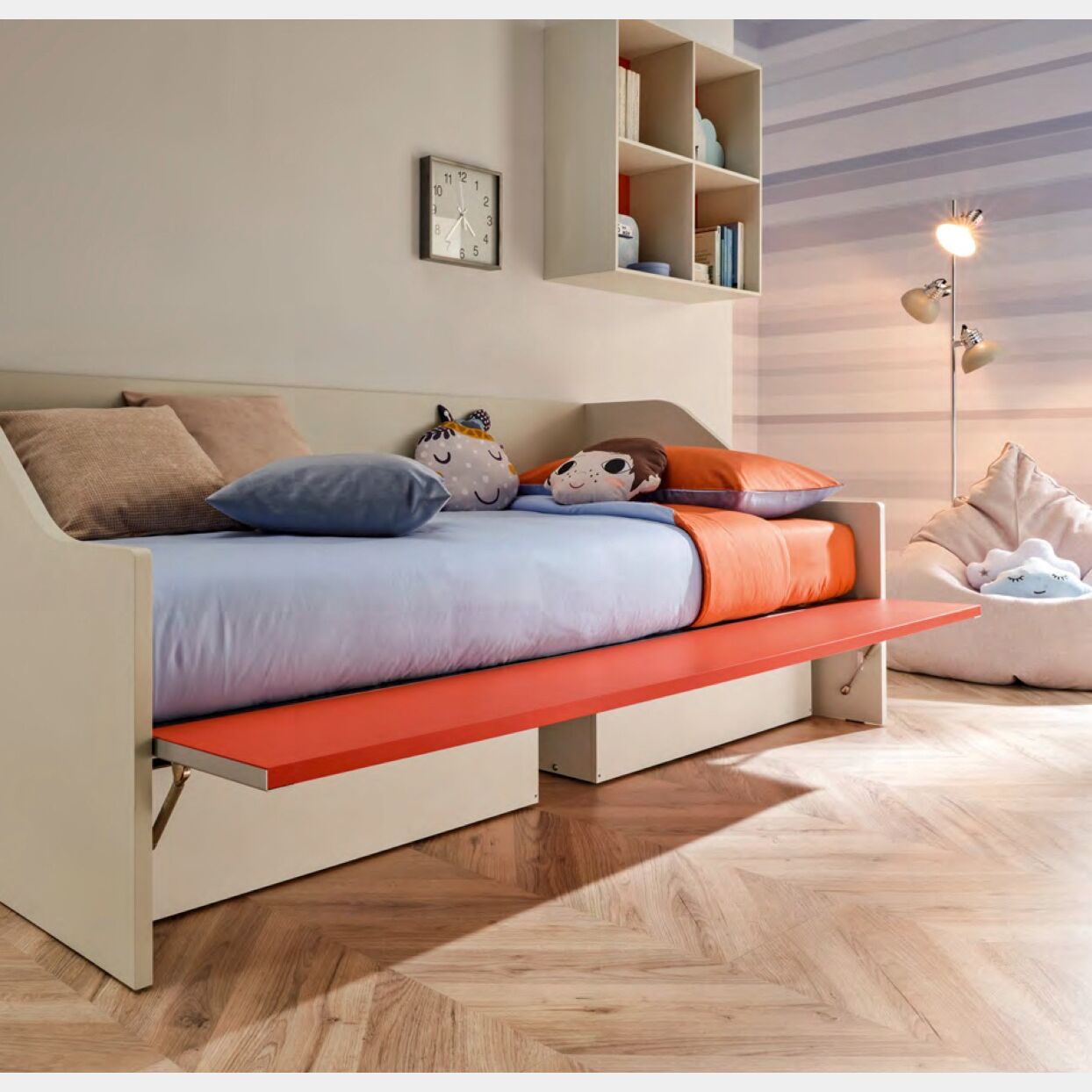 La fascia apribile proposta in Mattone laccato nasconde due pratici cassettoni che forniscono un ulteriore spazio per riporre coperte e giochi. La finitura Quarzo della struttura può essere sostituita con nobilitati, materici oppure laccati colorati.